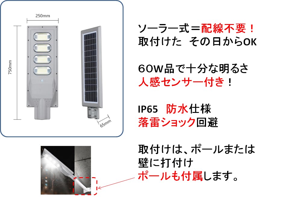 このソーラー式のストリートライトであれば電源は供給もいらずに、用途を満たします。