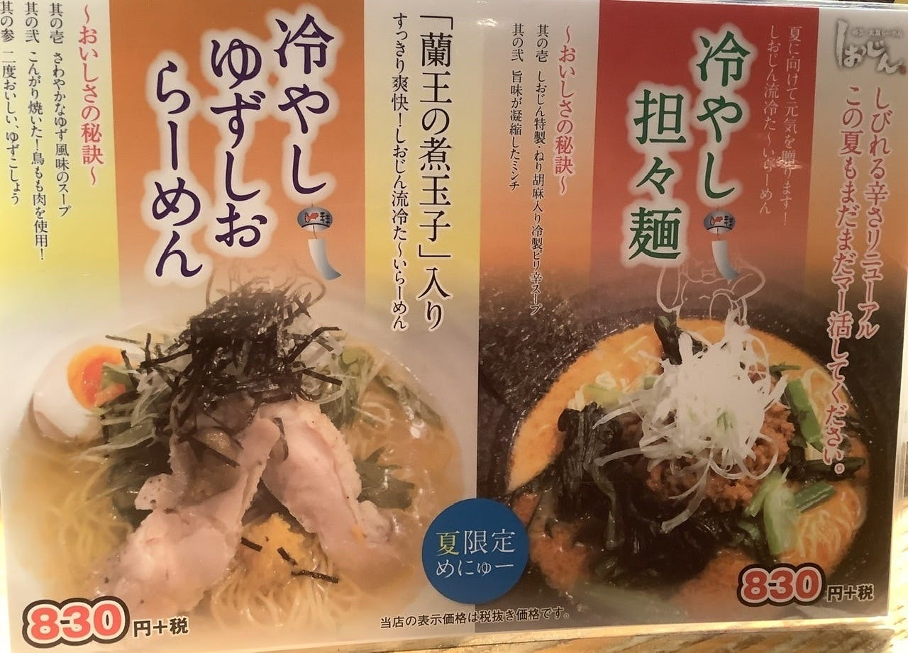 「しおじん」鳳本店、堺東店では冒頭の写真の「冷やしゆずしおらーめん」「冷やし坦々麺」
