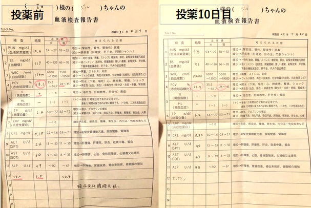 投薬前はPCV(赤血球容積比)が18.1%で、黄疸指数が陽性(+)でした。