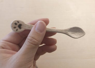 また、主人はモノづくりが好きなため、木製の肉球マークの入ったティースプーン(お値段の高い方にはカトラリーセット:ティースプーン、ヒメフォーク、バターナイフ)をプレゼントさせていただきます。サイズは写真を参考になさって下さい。ぜひ、ティータイムやペットの餌の用意などご利用下さい。
