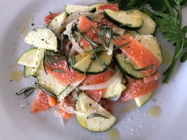 ローズマリーを使ったズッキーニとサーモンのサラダ(盛り付け例)