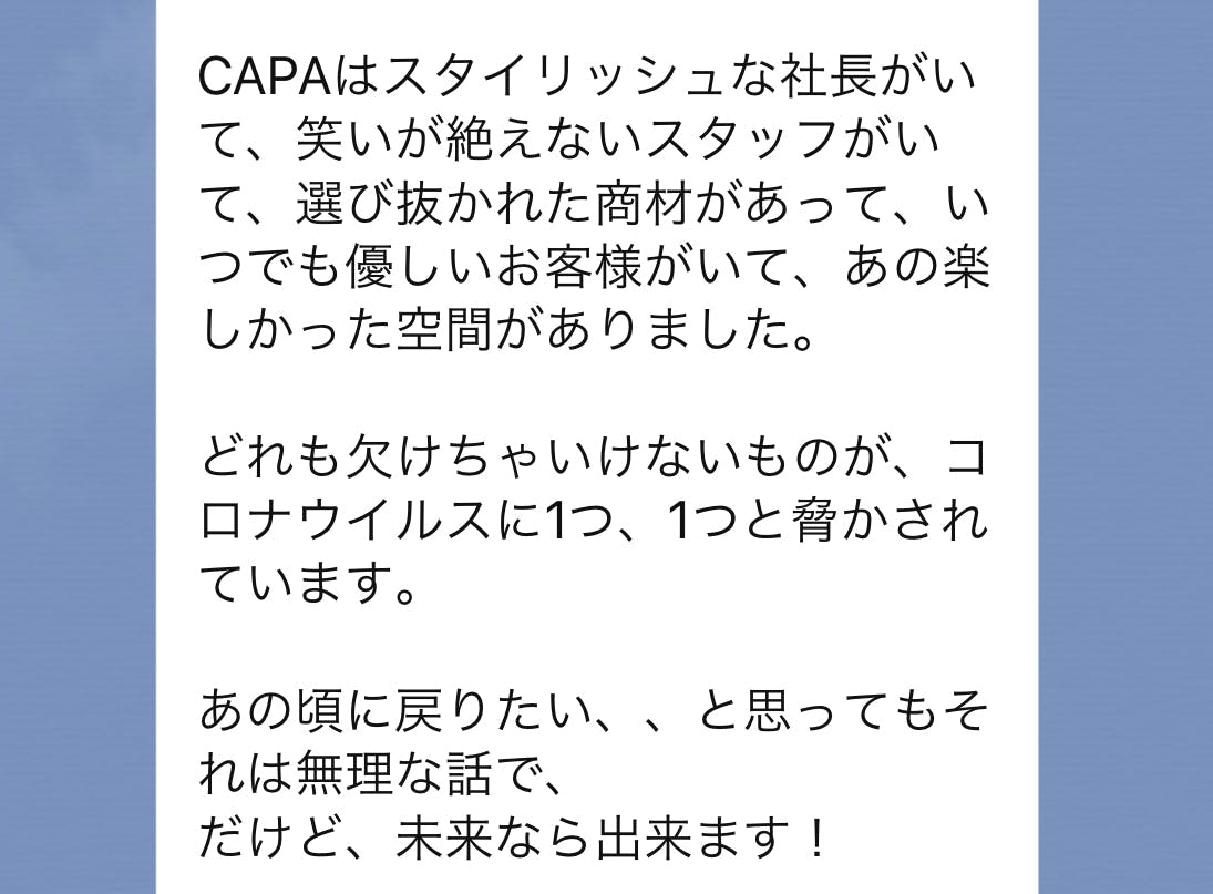 そしてご支援、応援して下さるお客様、CAPAを支えてくださっている皆様に