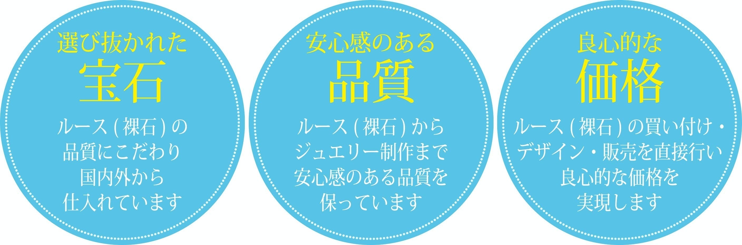 目で見て綺麗な宝石を選んでいます。輝ききらめくだけのジュエリーではなく、着け心地にもこだわり、安心感のある品質を心がけています。またルース(裸石)の買い付け・デザイン・販売の全てを直接行うことで良心的な価格を実現。毎日つけるジュエリーだからこそ、お届けするまでにお客様の目線で制作しています。