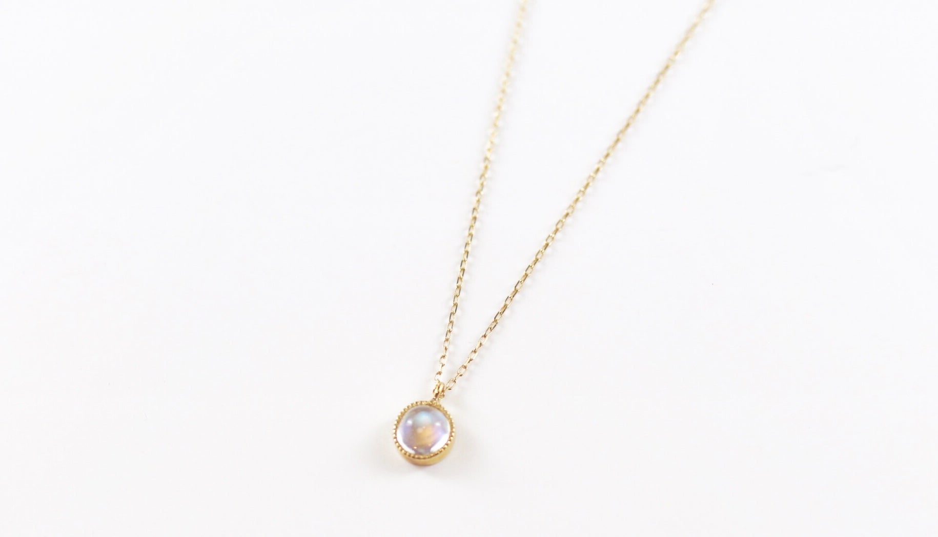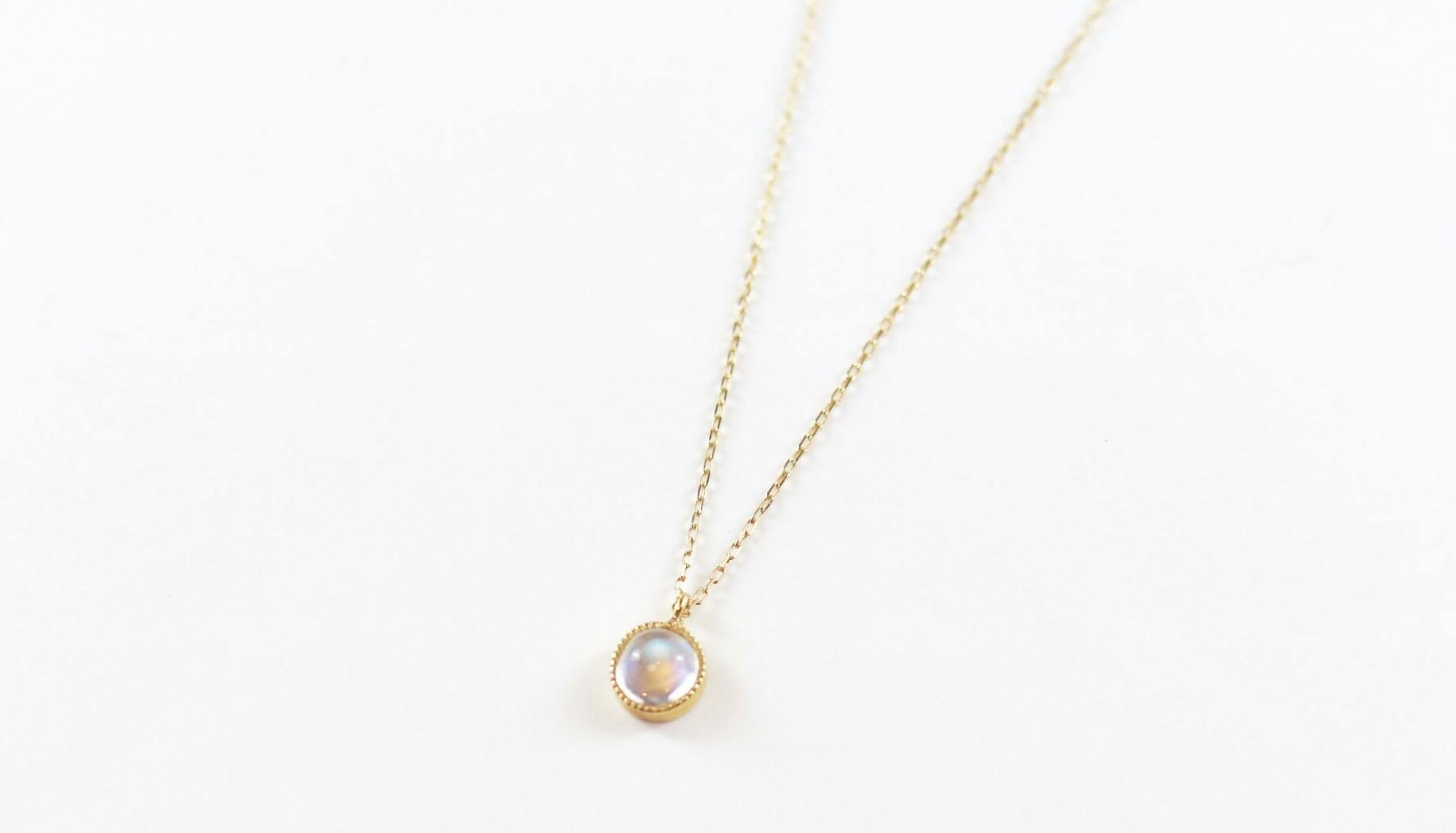 ルースはシンプルに爪で留め、小さくてもキラキラのミラーボールがアクセントのチェーンを合わせた可愛いペンダント加工