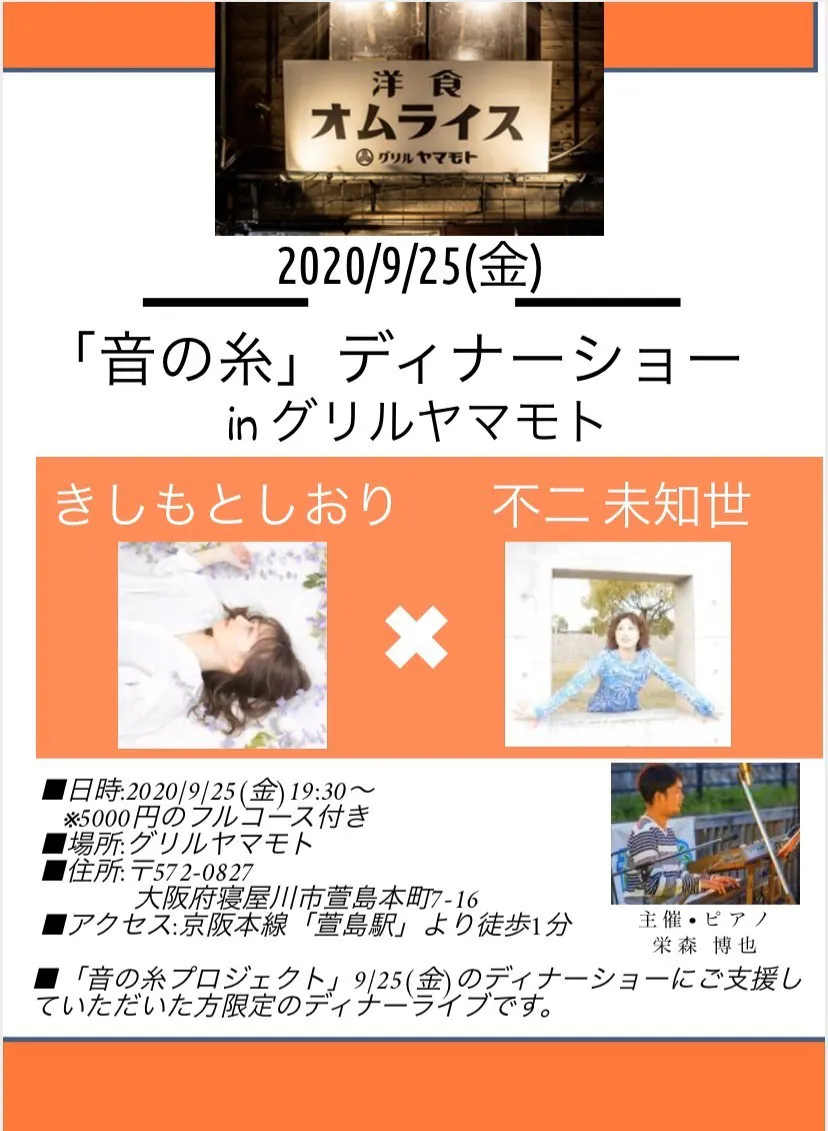 9/25(金)開催予定の「音の糸」ディナーライブ in グリルヤマモト(5000円相当のフルコース付) の詳細が決定しました!