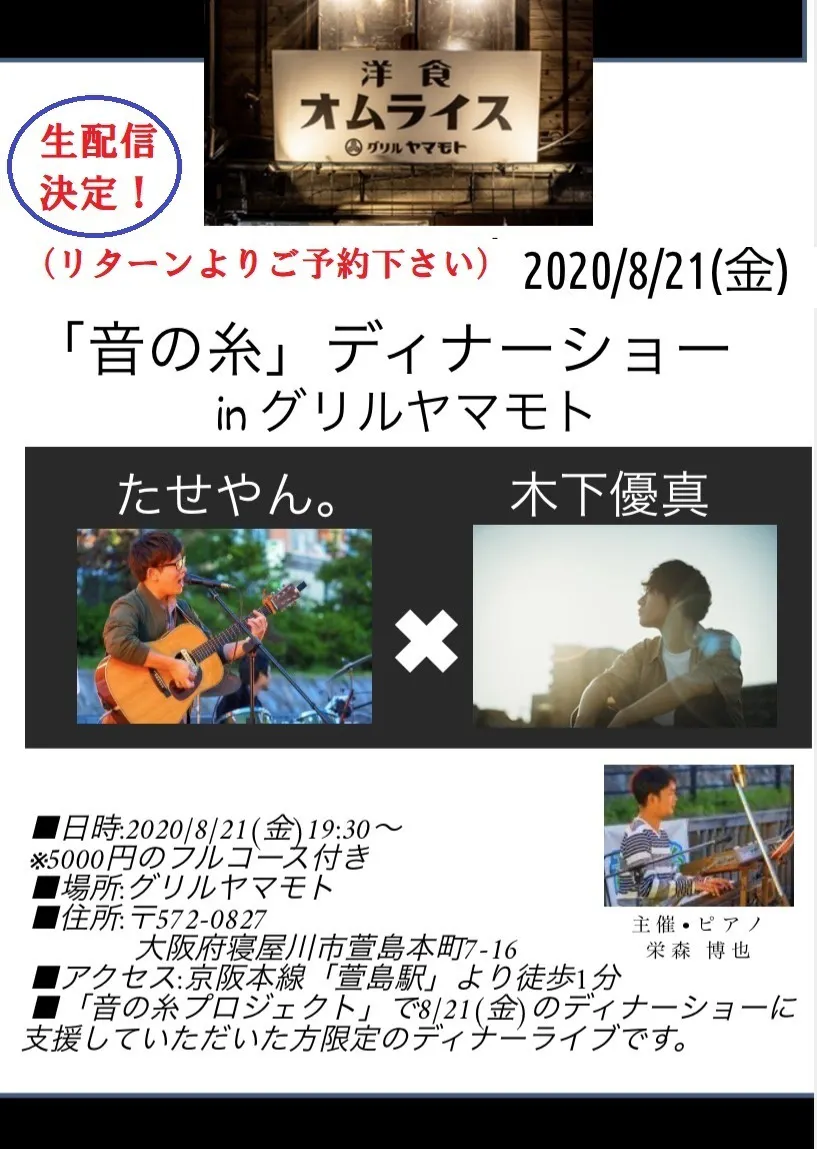 8/21(金)のディナーライブを生配信いたします!観覧チケットは2000円、たせやん、木下優真くんも参加している「限定CD付き観覧チケット」は4000円となっております。