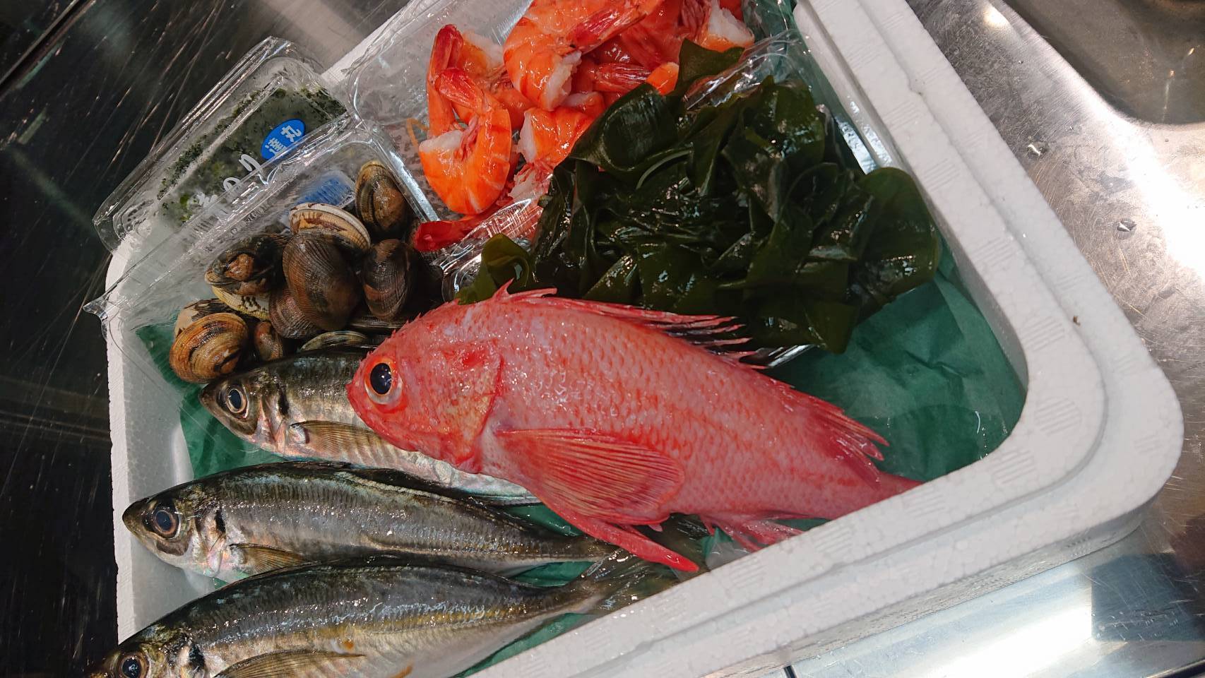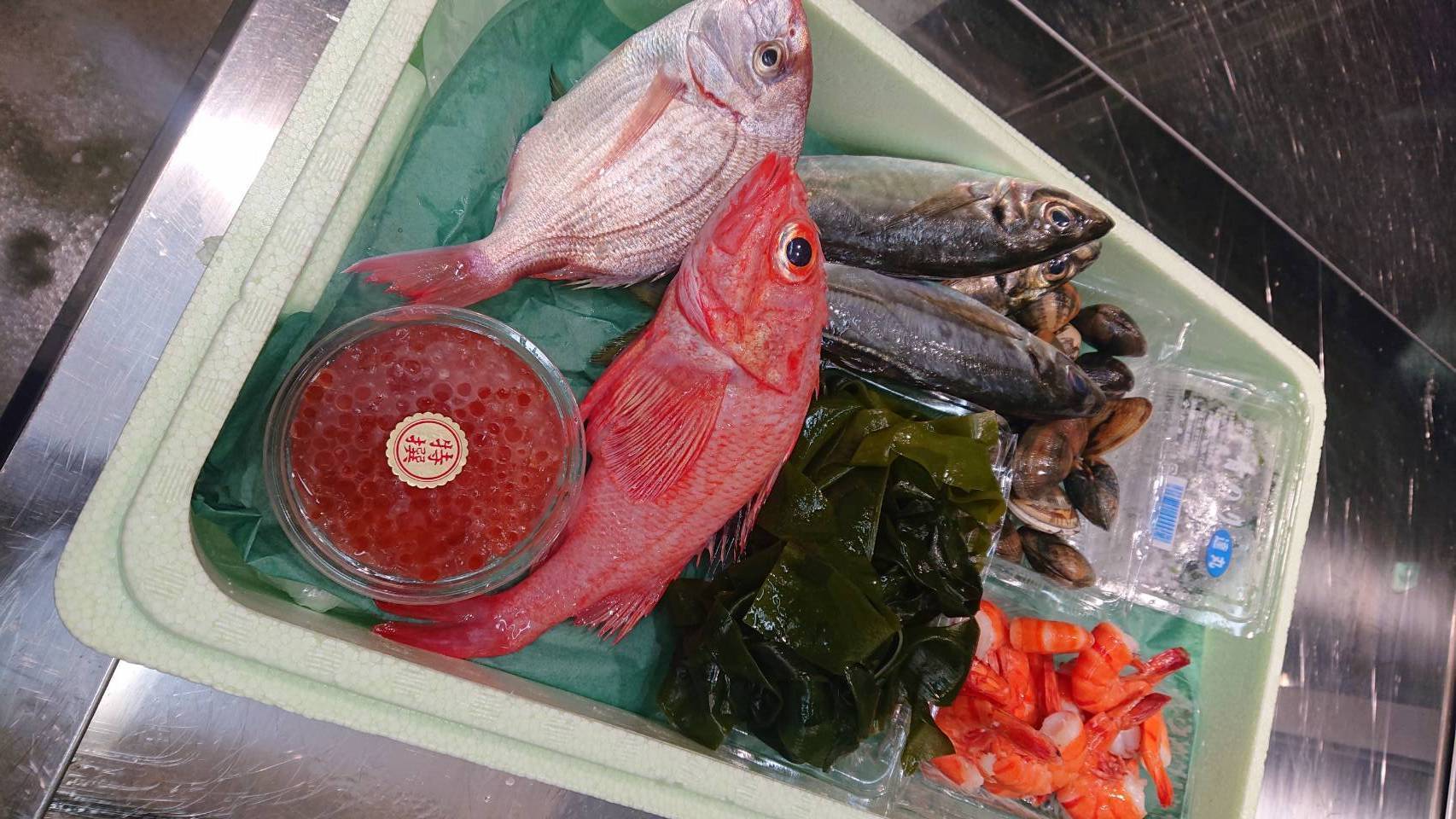 キンキ、あじ、アサリ、ボイルエビ、ワカメ、生のり