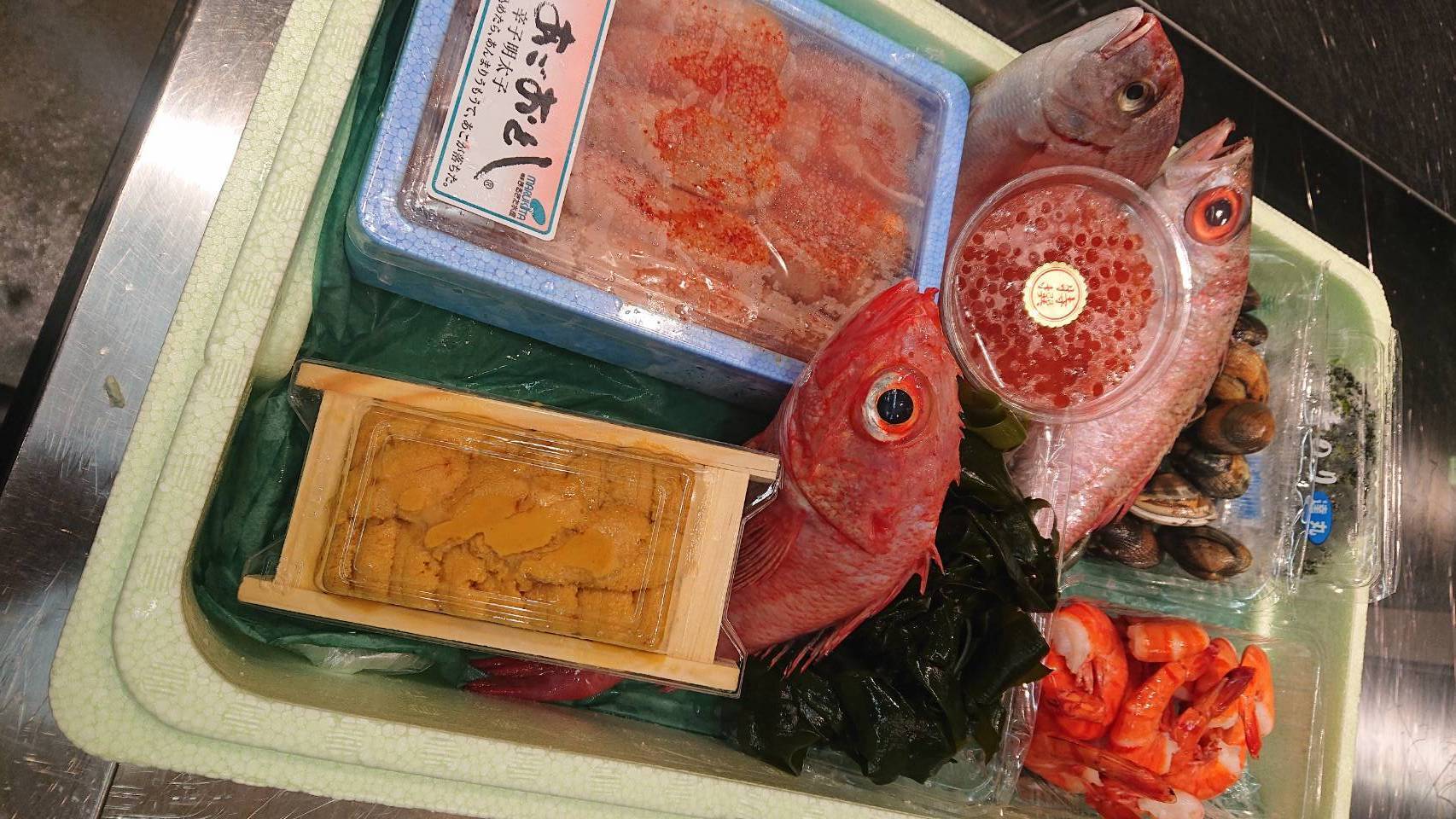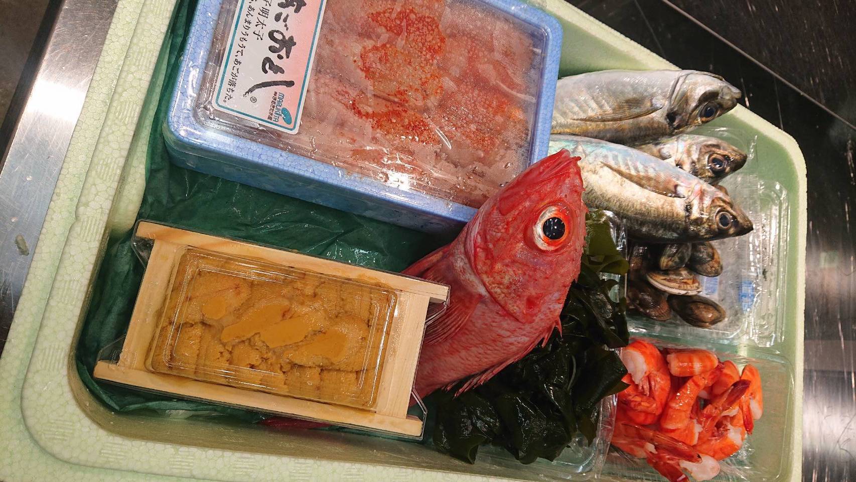 ノドグロ、キンキ、鯛、ウニ、イクラ、明太子、ボイルエビ、アサリ、生のり、ワカメ