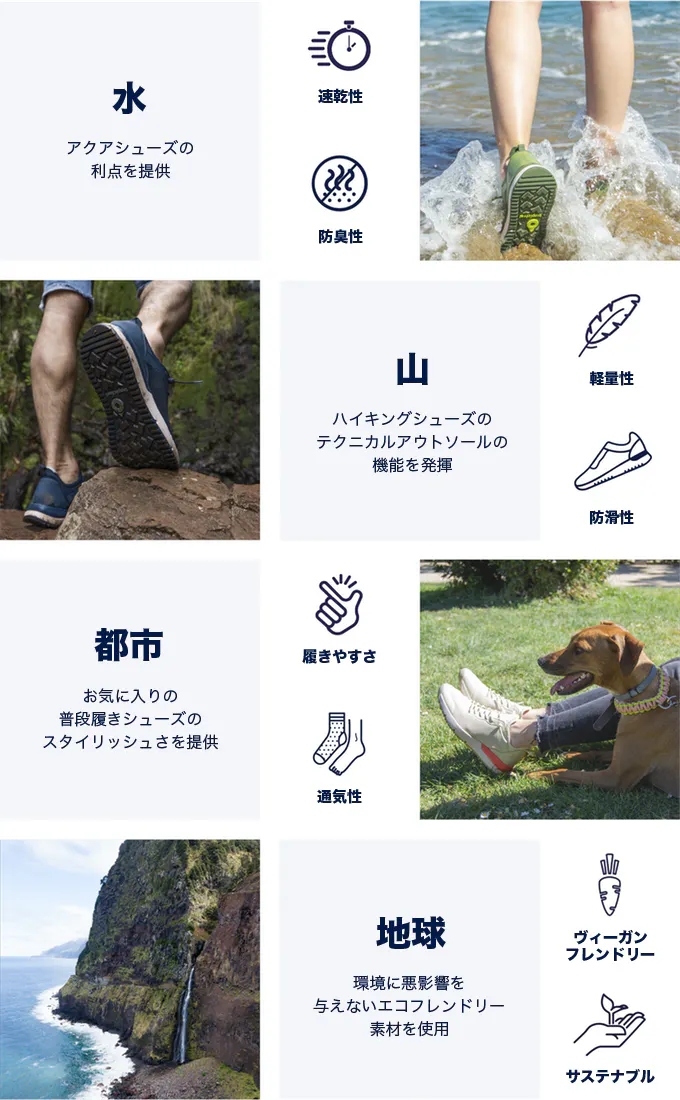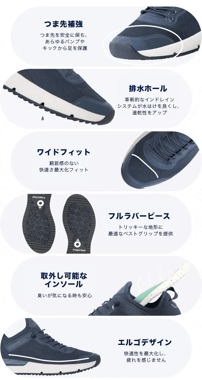 Tropicfeel(トロピックフィール)は、旅行やアウトドアを快適にする機能が詰まった革新的な新感覚シューズです。超軽量で濡れてもすぐに乾く優れもの。都市、水辺、登山など様々なシーンで活躍します。新しい靴のカテゴリー【トラベルシューズ】の誕生です。