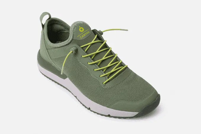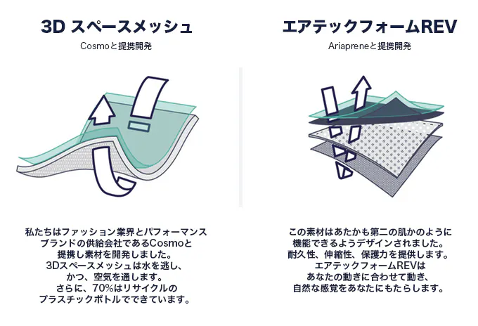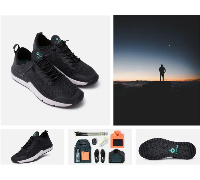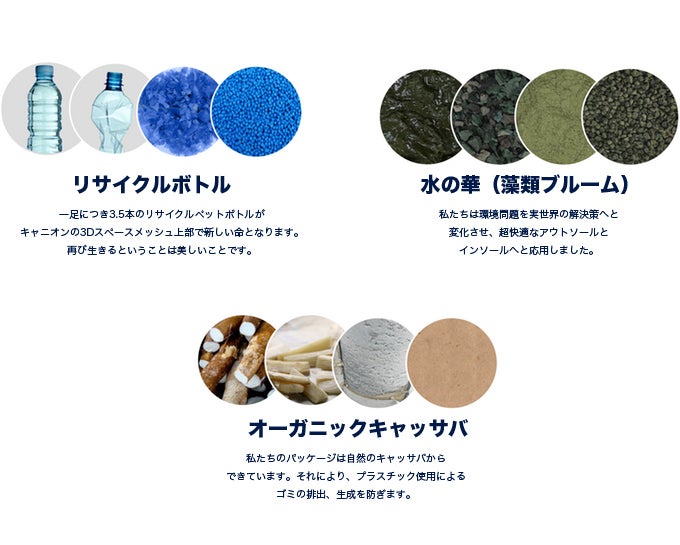 1. 表面材質プラスチックペットボトルのリサイクル:キャニオンシューズの表面3Dメッシュ素材の生地は、靴1足あたり3.5個のプラスチックペットボトルをリサイクルして作られました。