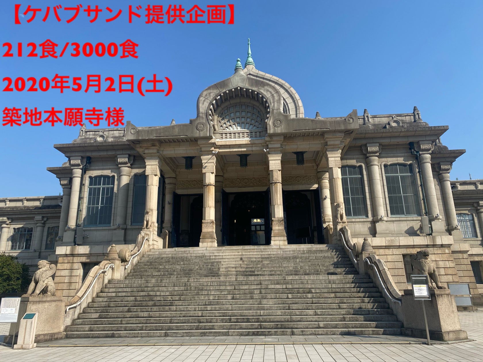 築地本願寺様にて、運営スタッフ様と敷地内にお住まいのご家族様にケバブサンド212食の提供を行いました。