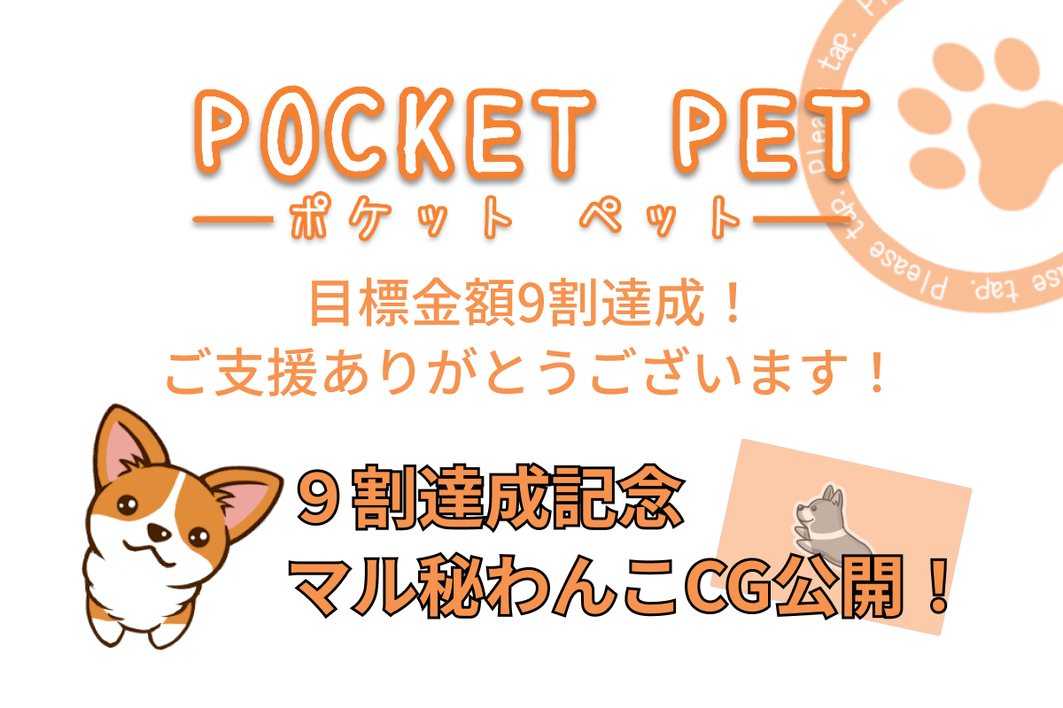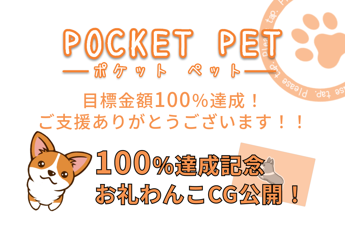 2020/10/04 12:00こんにちは。POCKET PET開発チームです。皆さまからのあたたかいご支援のおかげで、なんと開始から3日で目標金額の50万円を達成することができました!たくさんのご支援、スタッフ一同身に染みております。本当にありがとうございます!目標金額100%達成のお礼といたしまして、POCKET PETのスタート画面に使用されているCGのフル画像を公開いたします!ご支援いただいた皆さま、本当にありがとうございました。募集期間はまだ先ですが、早速ミニゲームとかわいい仕草の開発に取り組ませていただきます。また新たに200%ストレッチゴールを設定して、さらに皆さまに深く楽しんでいただけるよう、精一杯頑張ります!引き続きの応援を何卒よろしくお願いいたします! もっと見る