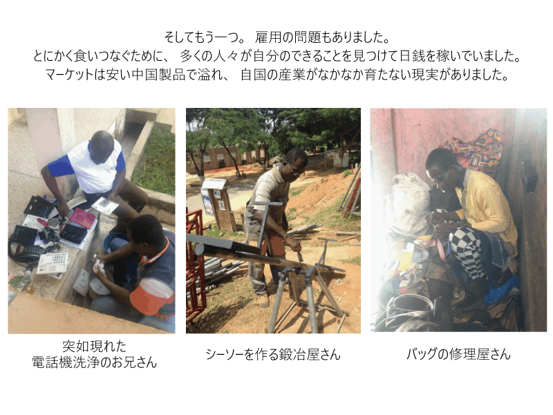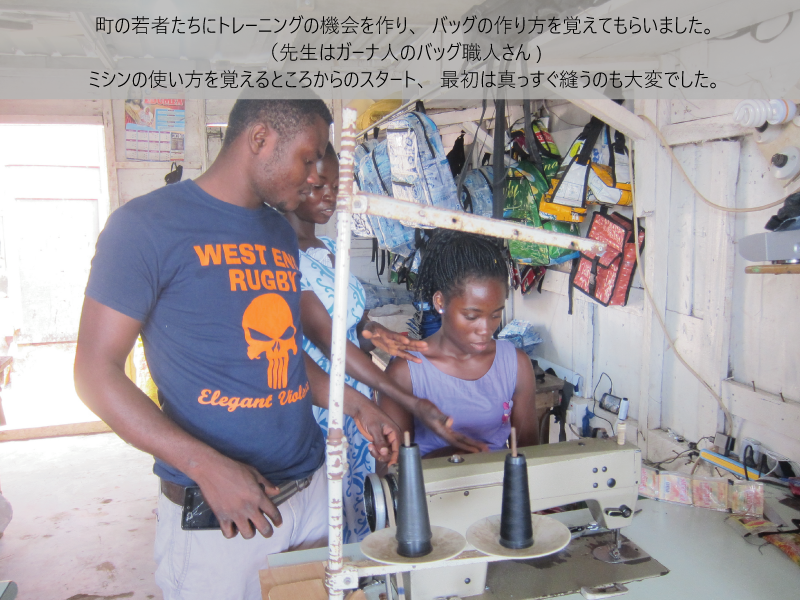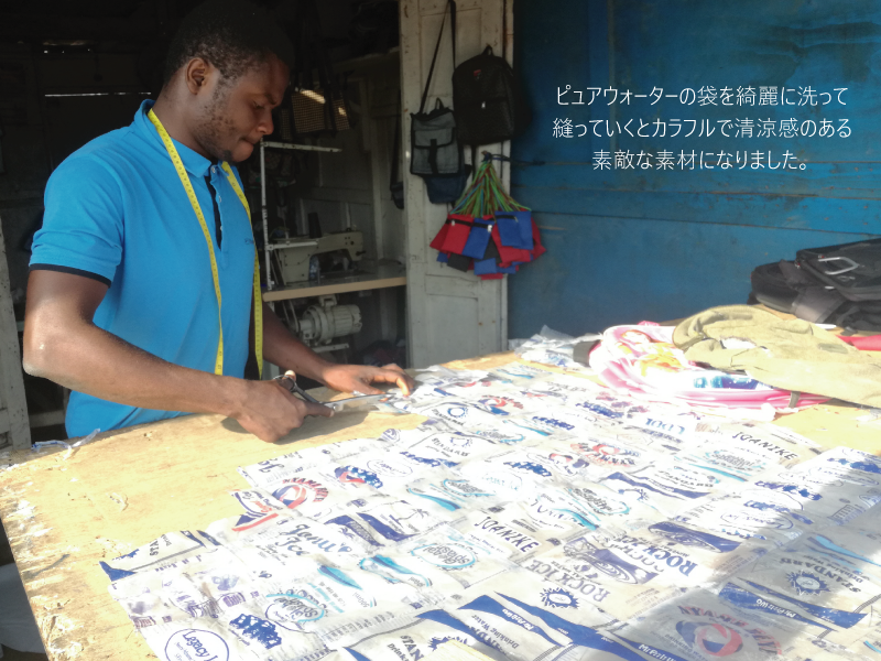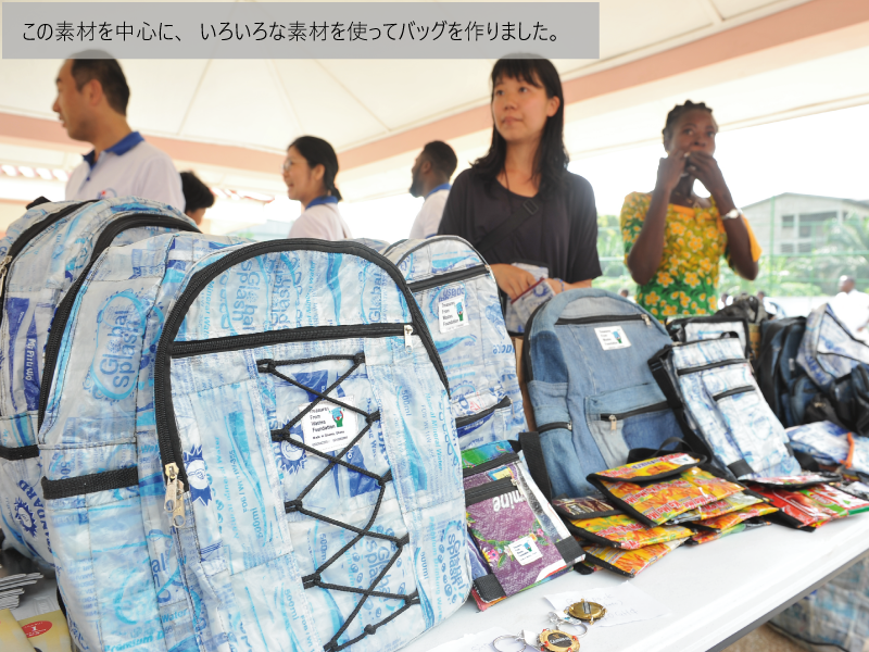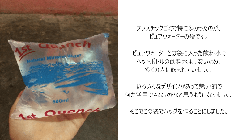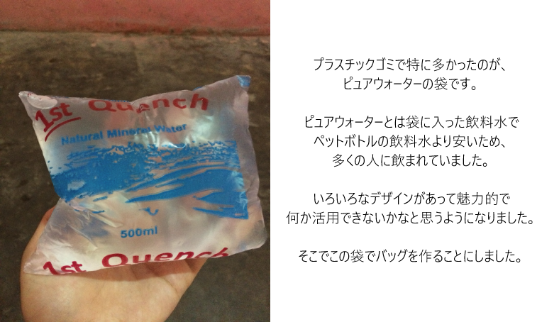 具体的には飲料水「ピュアウォーター」の袋を再利用した、バッグやポーチを村の若者たちと一緒に作り販売をしていました。