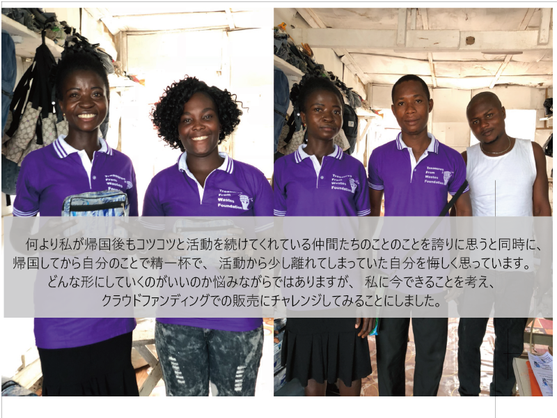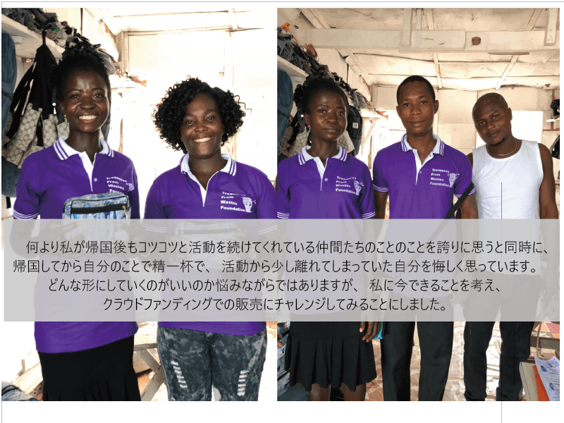 2020/11/03 16:16こんにちは。トレジャの小林です。先日プロジェクト期間を終了しました。多くのご支援に改めて感謝申し上げます。ありがとうございました。協力隊の期間を終え、帰国してから早3年近くが経ってしまいました。私は自分の生活に追われ、なかなか動けない日々が続いており、もどかしい気持ちを抱えていました。私とガーナにいるプロジェクトパートナーEdwardが始めたこの活動は、まだまだ成長できるし、面白い展開ができると思っていたからです。ガーナではメンバーがささやかではありますが、活動を続けてくれています。「環境のため」「雇用創出のため」それが私たちの活動の軸ではありますが、でも何より「不要にされていたものに価値が与えられ、必要とされる」「自分たちが思い描いたことが形になっていく」ことの面白さに皆がわくわくしながらやってきました。私たちがピュアウォーターの袋を使ってバッグを作っていることに、何よりびっくりしていたのがガーナ人でした。写真はびっくりして、「欲しい!」と言っているガーナの子どもたちです。原動力を大切に、日本での販路、そしてガーナでの販路も見つけていきたいなと思います。今思っているのは商品の数を増やしたい!ということ。どなたかご協力いただけるデザイナーさんいらっしゃらないかな。募集中です。今回ご協力いただいたOhayo Ghana FoundationさんとHIYOYA基金さんにも感謝の気持ちしかありません。ありがとうございました。私たちは皆コロナ渦で制限されながらの活動となってしまっていますが、少しずつでも活路を見出してやっていきたいなと思います。リターンのお届けに向けて、これから進めて参ります。引き続き、どうぞよろしくお願い致します。 もっと見る