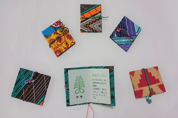 中身はガーナの伝統的な絵文字、アディンクラを紹介しています。(大きさ:縦8cm 横6cm)