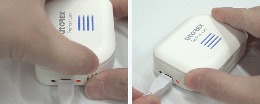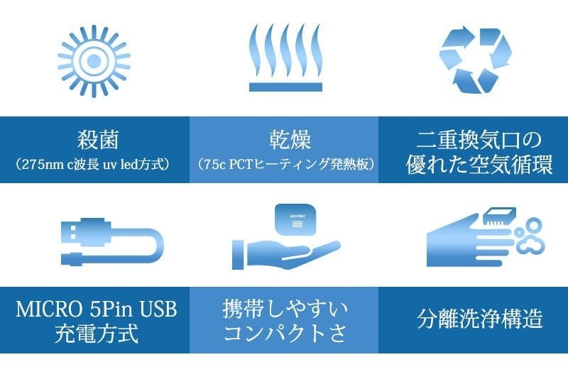 A)乾燥機能は同封されているチャージケーブルがつながった状態でのみ作動し、つながってない状態の場合、UV-C LED殺菌機能のみ作動されます。ご注意してください。