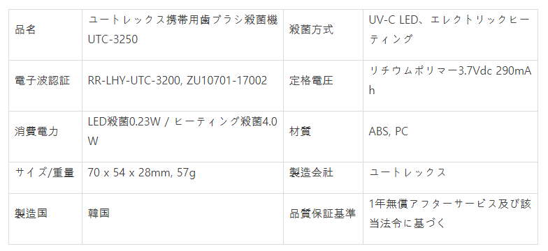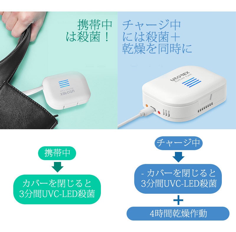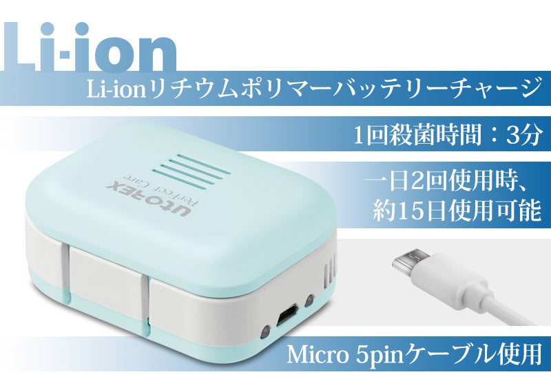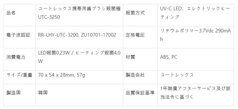- 業界でも圧倒的な技術力と満足度でトップである「ユートレックス」が従来の携帯用歯ブラシ殺菌機をさらにアップグレードさせ、日本で初めて発売することになりました。ユートレックスは1999年から続けてきた生活家電製品に対する高い技術力を持ち、アメリカ、ヨーロッパ、中国、東南アジアに輸出しており、韓国の殺菌機市場の70%を占有している企業です。