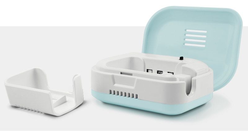 ユートレックス歯ブラシ殺菌機「mini」。チャージする時、ヒーティング機能でデュアル殺菌と乾燥が行われますので、追加費用なしにより経済的に使用できます。