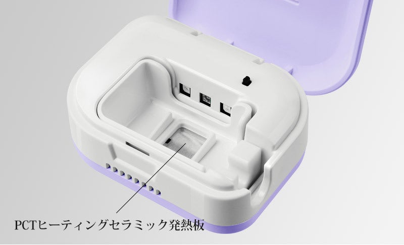 携帯中にLED殺菌のみ作動します。しかしUSBがつながっている間(チャージ中)にはヒーターが作動、機器設定温度である75度を維持しながら早い乾燥と殺菌を行います。「mini」から取り出すとサラサラ乾いている歯ブラシをと出会えます。