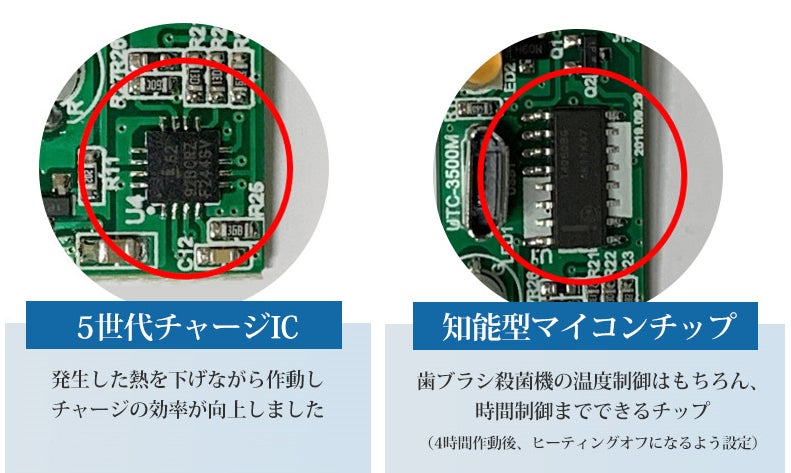 また、歯ブラシ殺菌の内部のチャージ等、電源機能を担当している最新の5世代チップを使用して、安全かつ素早くチャージでき、歯ブラシを乾燥させるマイコンチップを使用して4時間乾燥後自動で電源を遮断します。