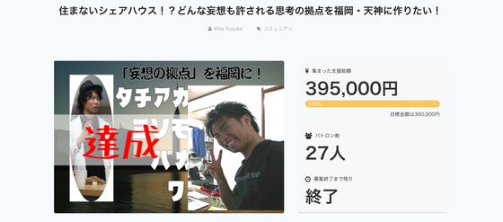 2017/06/26 18:256/23の0:30頃に達成し、その後35000円の新たな入金があって無事に達成することができました! 想像以上に多くの知人の方からご支援いただいたこともあって、「ああ、みんなしっかりみてくれているのだな」と非常に満たされた感覚を味わうことができました。 さて、みなさまからご支援いただいたおかげで当分、このすまないシェアハウスの運営はなんとかなりそうです。 ただ、ご支援の多くが福岡県外からのご支援ということもあって夏休みや秋休み、そして春休みにに多くの方が福岡に訪れてくださると考えているので、そのときは全力で福岡をご案内させていただきます! .....と同時にこの福岡の妄想拠点で私の知人の方と福岡にいる人たちの間で何か面白い妄想や遊びができればと思い、新しいワークショップや企画をどんどん立ち上げています。 ここは福岡の妄想拠点 しかし、最終的に目指すのはこのような妄想の拠点を日本全国に作り、遊牧民のように各地を転々と旅しながら生活する人たちの受け皿となり、そのような人たちと地元の人たちが交流し、妄想の企画でどんどんおもしろいものが生まれていくことです! このプロジェクトははじめの一歩として。 みなさまのおかげとして最高のスタートがきれたことを心から感謝いたします! もっと見る