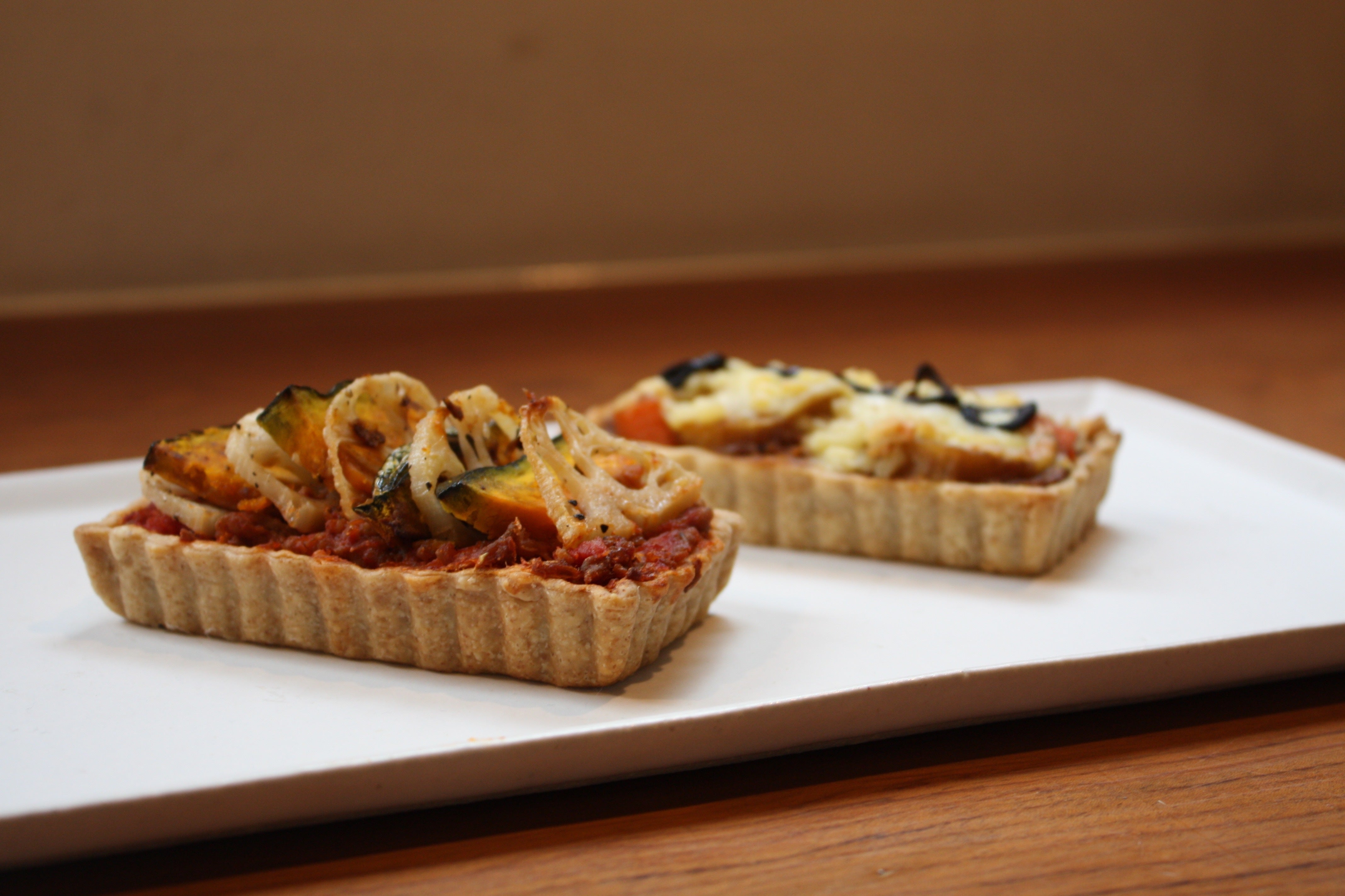 ハーブの風味と鷹の爪がピリッと効いた自家製ミートソースにほくほくの南瓜と蓮根のガーリック炒めを交互に並べた目にも楽しいタルトです。下層にはマッシュポテトを敷いています。