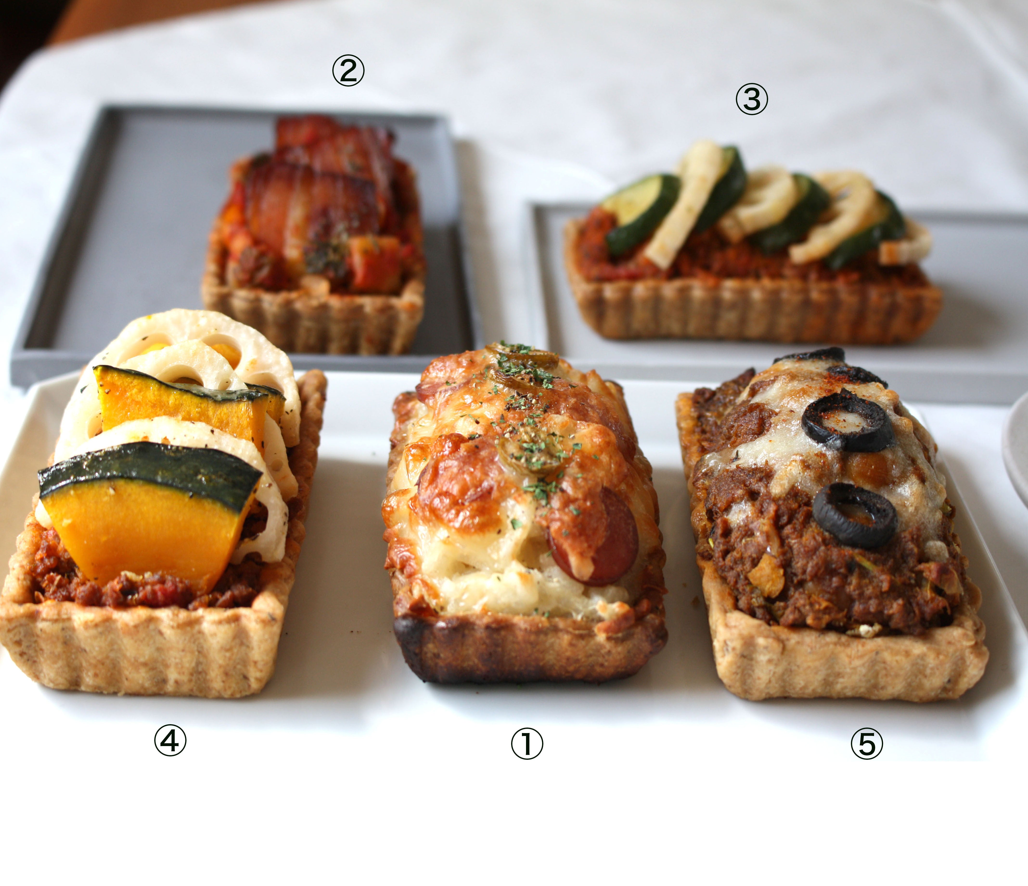 現在すでに上の5種類の惣菜タルトがあります。見た目も華やかでタルトとはいえ2つ食べたらお腹もしっかり満たされます。種類もあるのでお好きな惣菜タルトがきっと見つかります。