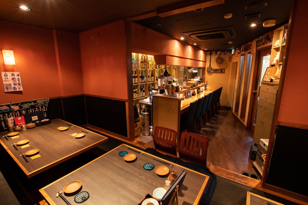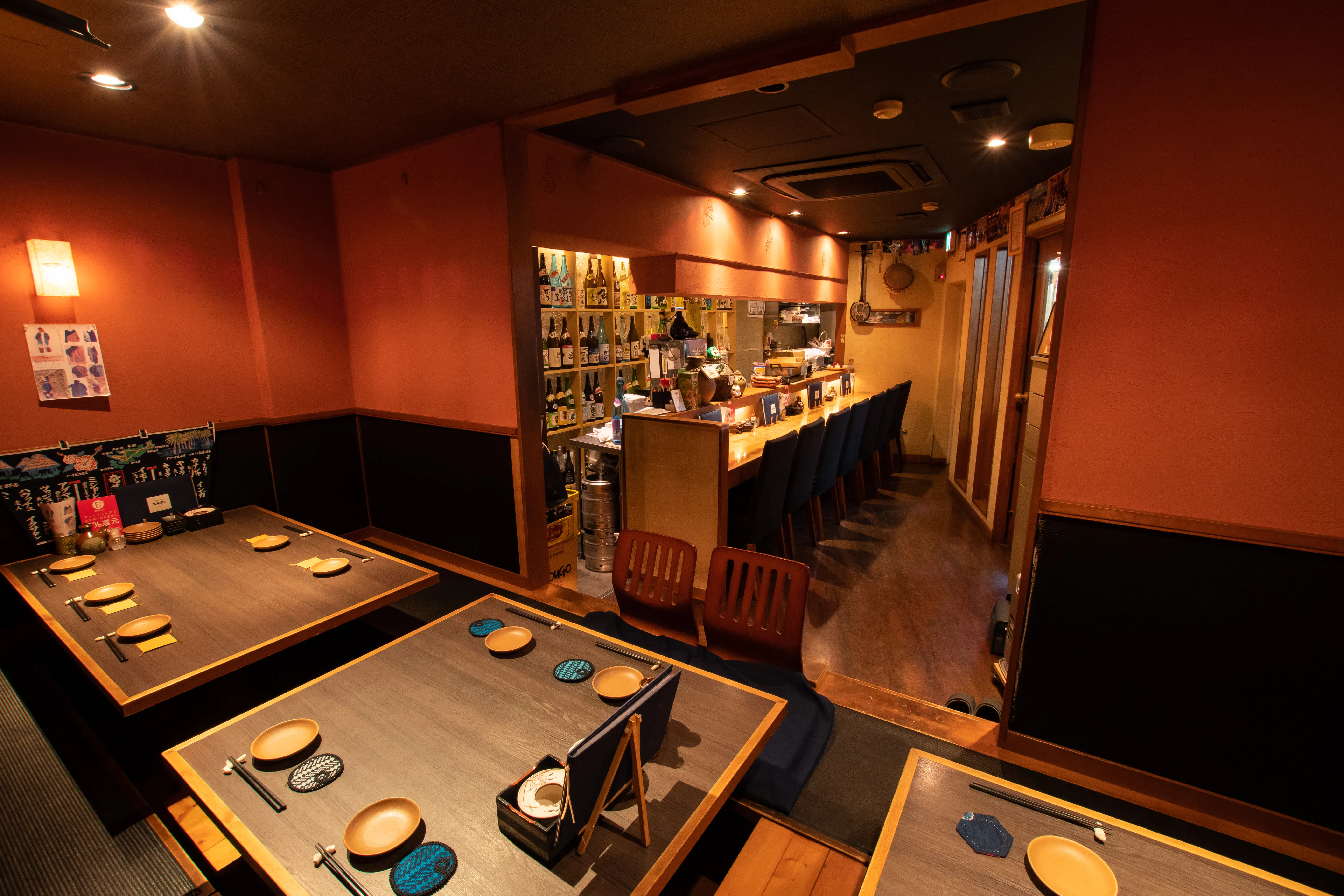 小上がりは大工さんの手作りテーブルが3つ、全て移動可能で18名までの宴会が可能です、座面と腰壁はこだわりの黒畳で床暖房も完備しております。
