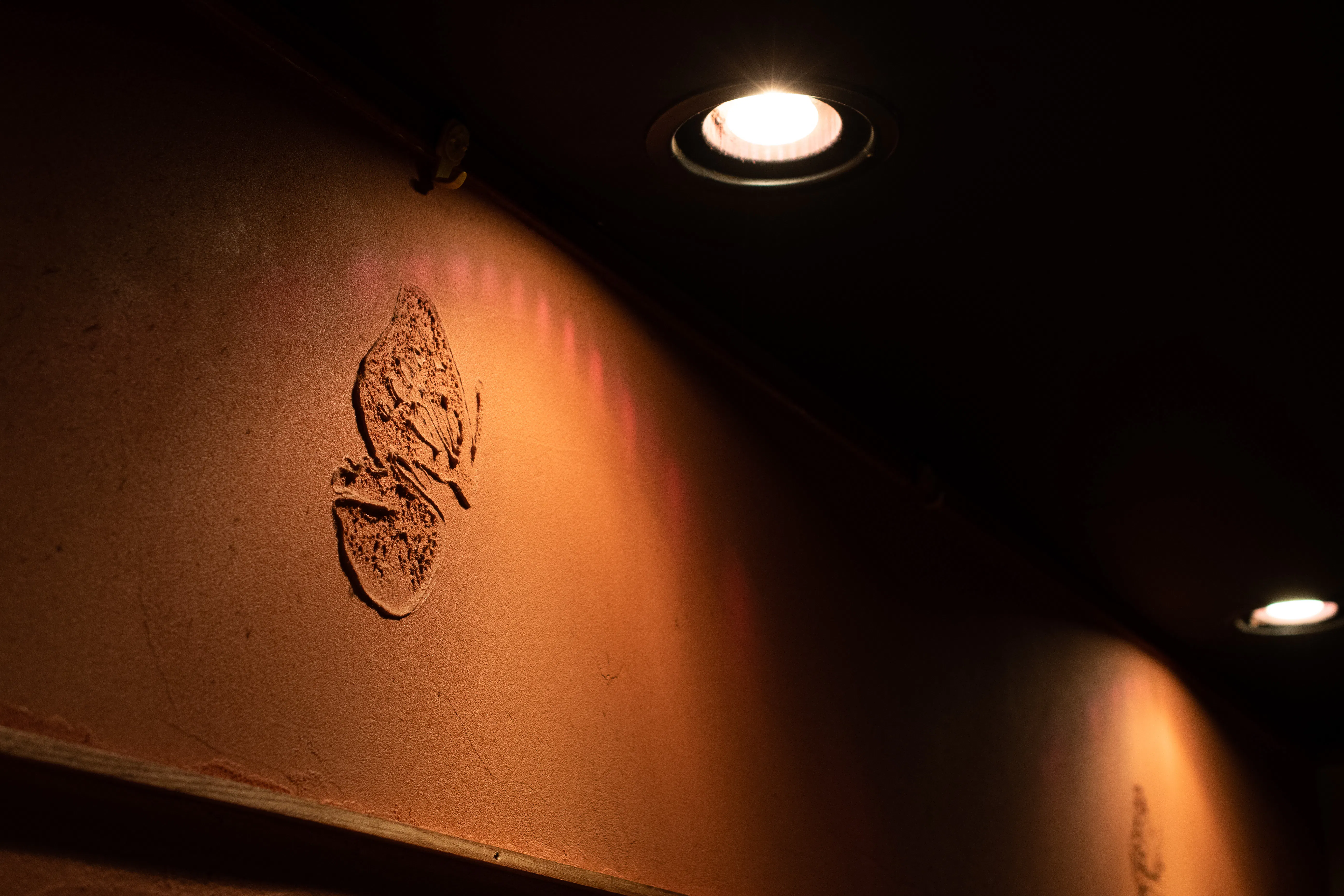 正面入り口は店内が見えやすい様にガラスを多く使い、店内は初期のお店のロゴであった「ツマベニチョウ」と言う南の蝶(小学生の時に夏休みの自由研究で奄美大島にて蝶の標本を作った思い出の蝶)の色を基調に朱色と黒と白を使った店内になっております。