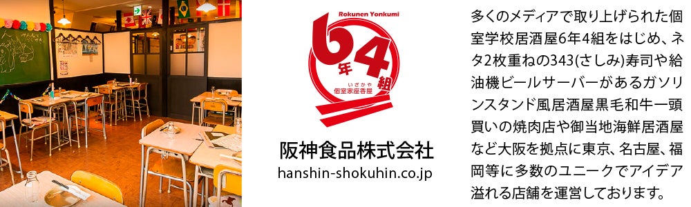 「個室居酒屋6年4組」:大阪梅田分校/大阪阿倍野天王寺分校/福岡天神分校/愛知名古屋名駅分校/愛知栄分教場/東京渋谷分校/東京新宿東口駅前分校/東京池袋東口分校