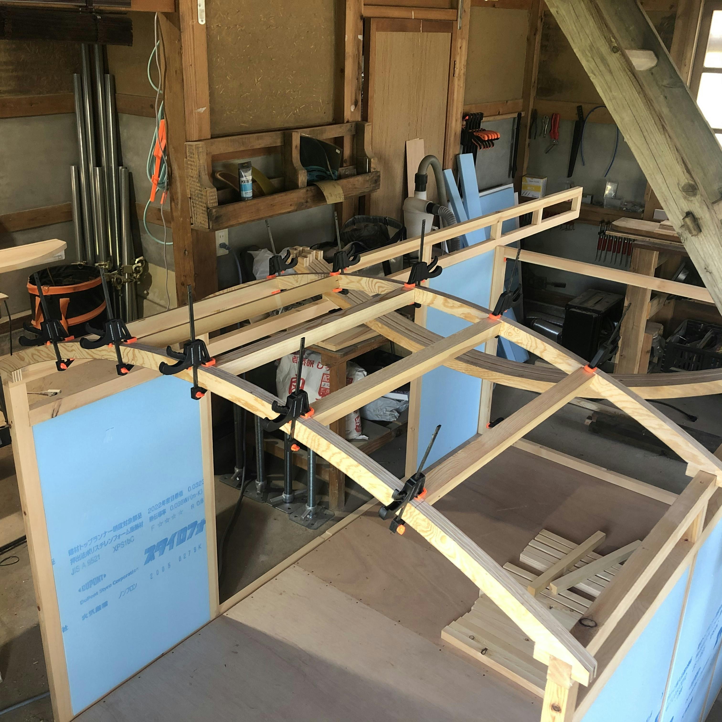 2020/06/23 17:55Rの屋根は楽しい!子どもの頃には作れなかったワクワクが詰まってる。いやぁ大人になったなぁ。どうやって留めようかと思ってたけど、3本しかないクランプがまさかのジャストサイズ!3つの橋を繋いでやってみようと思います。お楽しみに!#モバイルハウス#旅する工房#アーチ状#クラファン達成#woodenseed もっと見る