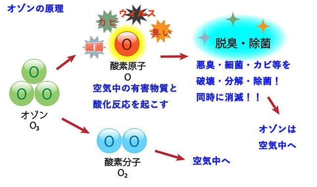 オゾンは酸素(O2)に比べると非常に不安定な化合物のため、時間が経過するとともに徐々に酸素へと変化していきます。