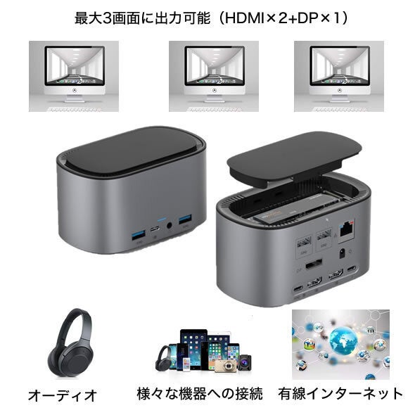 - ③13ポートの高い拡張性!USB-Cドッキングステーション。外部電力でノートパソコンの充電もOK