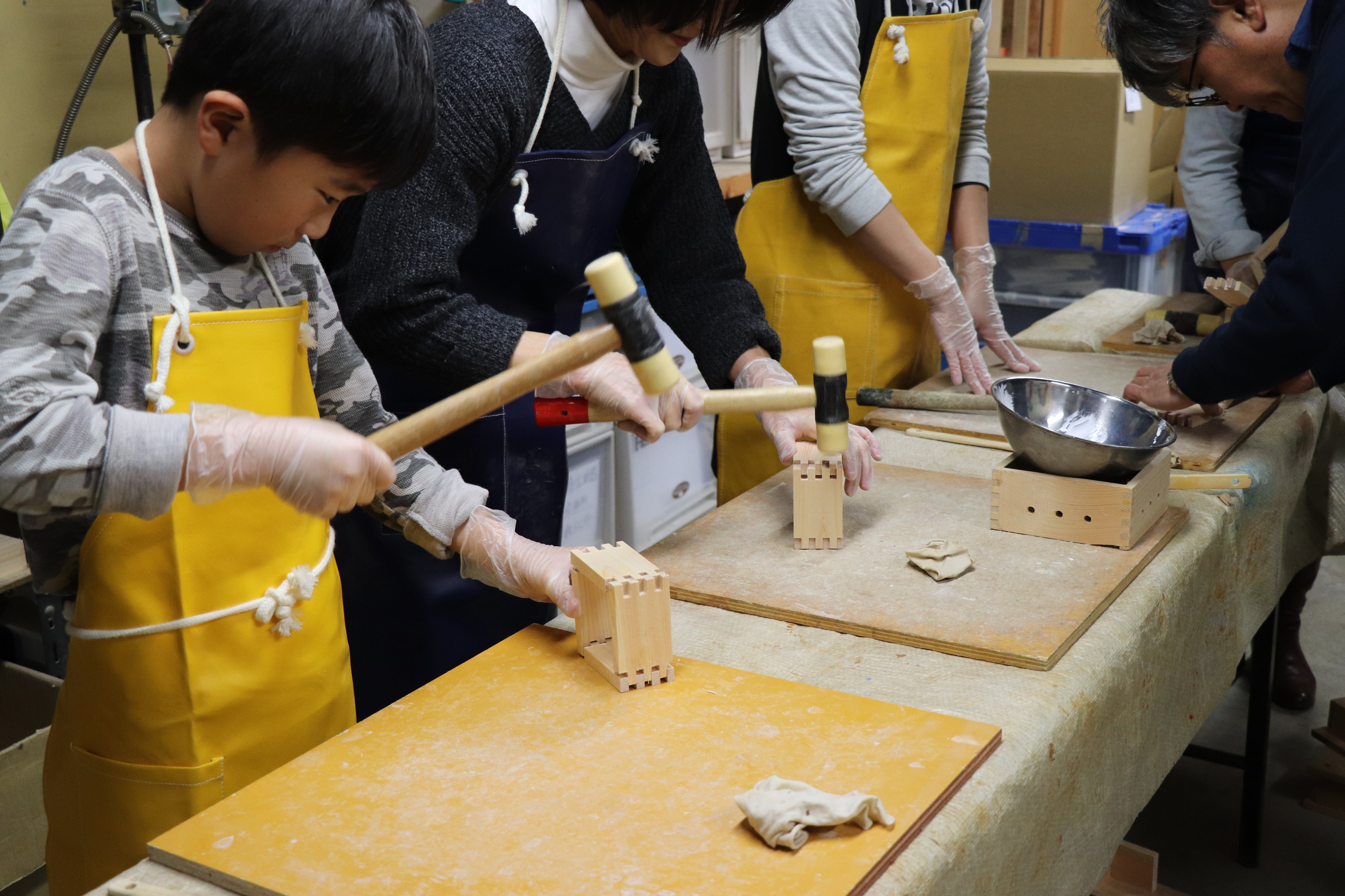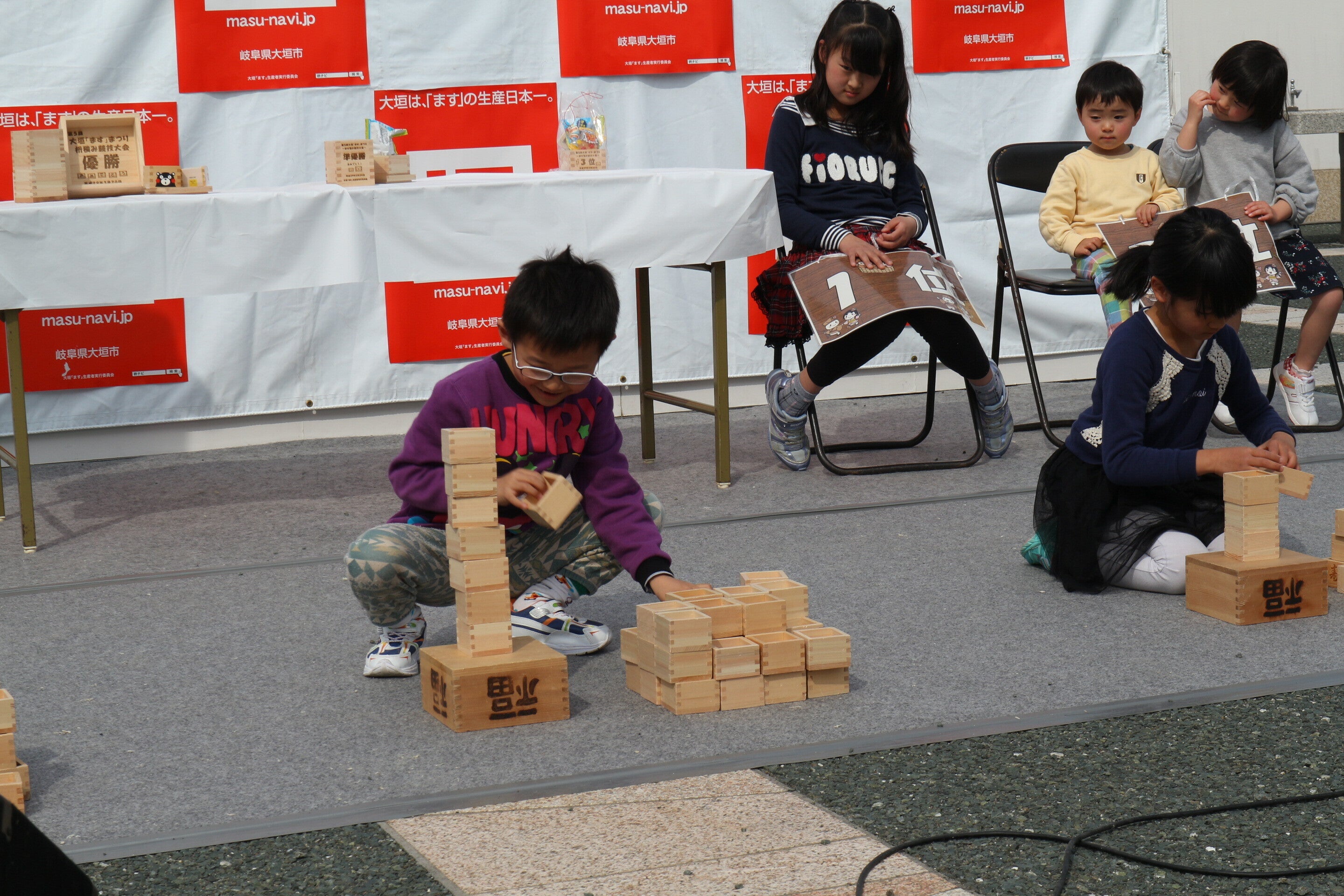また、地場産業として地域の子どもたちにもっと伝統工芸品を身近に感じてもらえるように、枡の組立を行う「枡づくり体験」のワークショップ(写真左)や工場見学、枡を使ったゲームを楽しんでもらう地域イベント「大垣ますまつり」(写真右:ます積みゲーム)も開催しております。