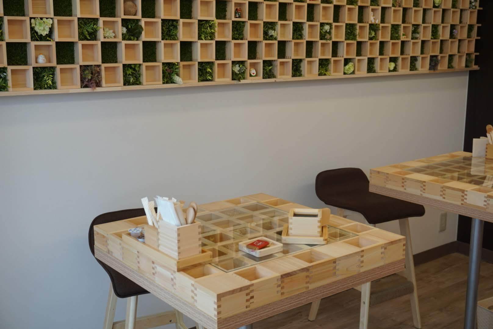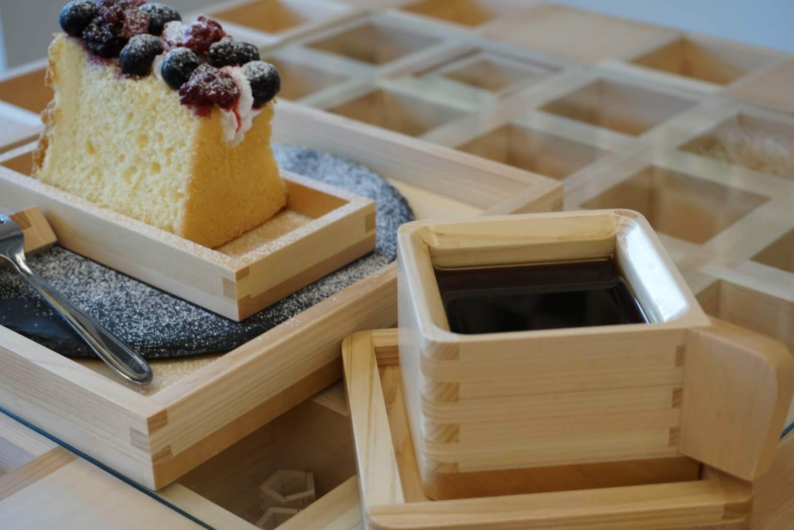 2018年11月には、大垣駅前商店街で若い方にも気軽に枡やヒノキを楽しんでもらうため枡でスイーツやコーヒーを提供する「masu cafe」を開業いたしました。壁や机にも枡を使用して内装材としても提案しています。