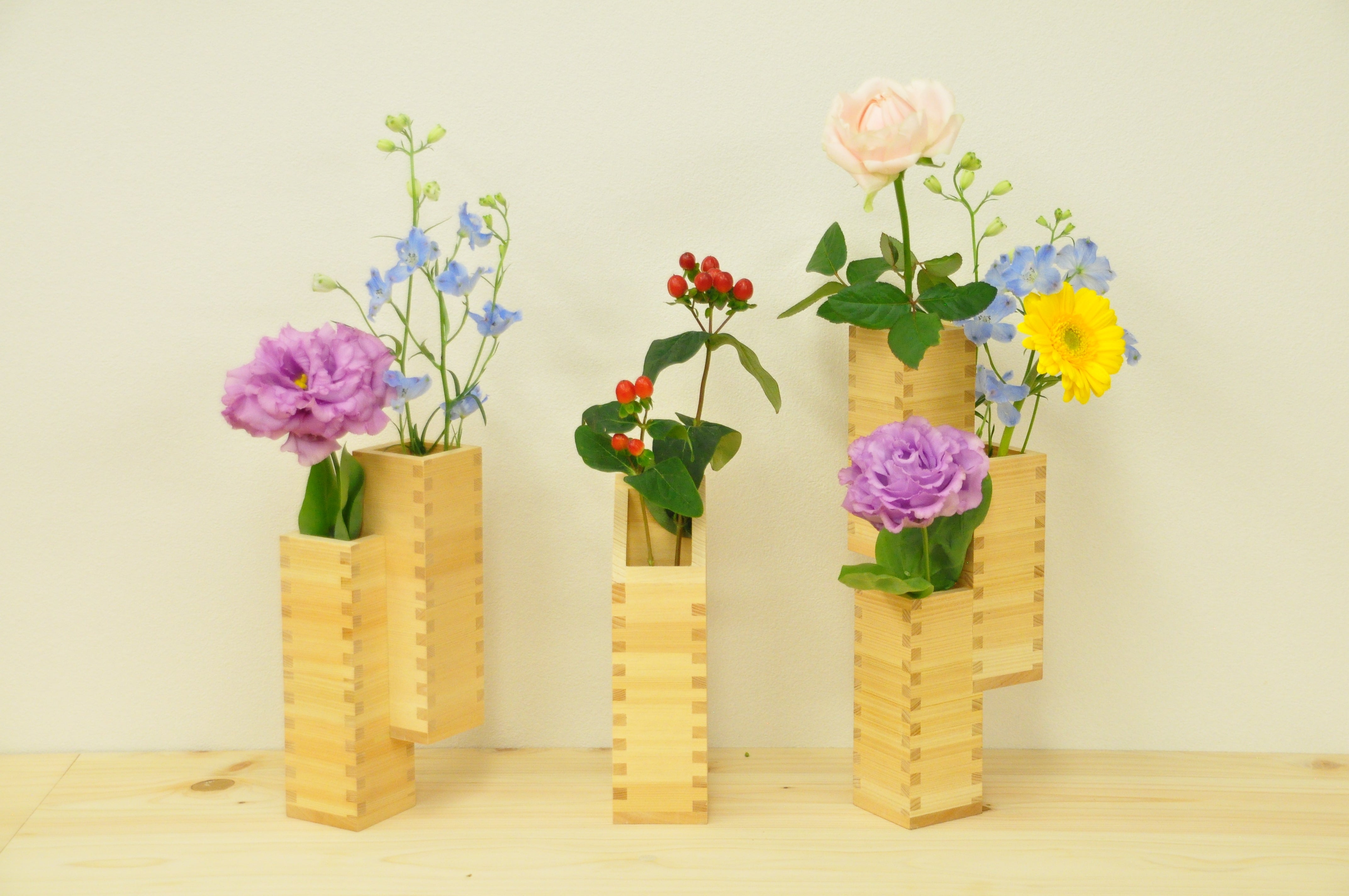 ◆国内外のデザイナーとの協同開発(左:ヒノキとハーブ香る入浴剤 右:枡の花瓶)