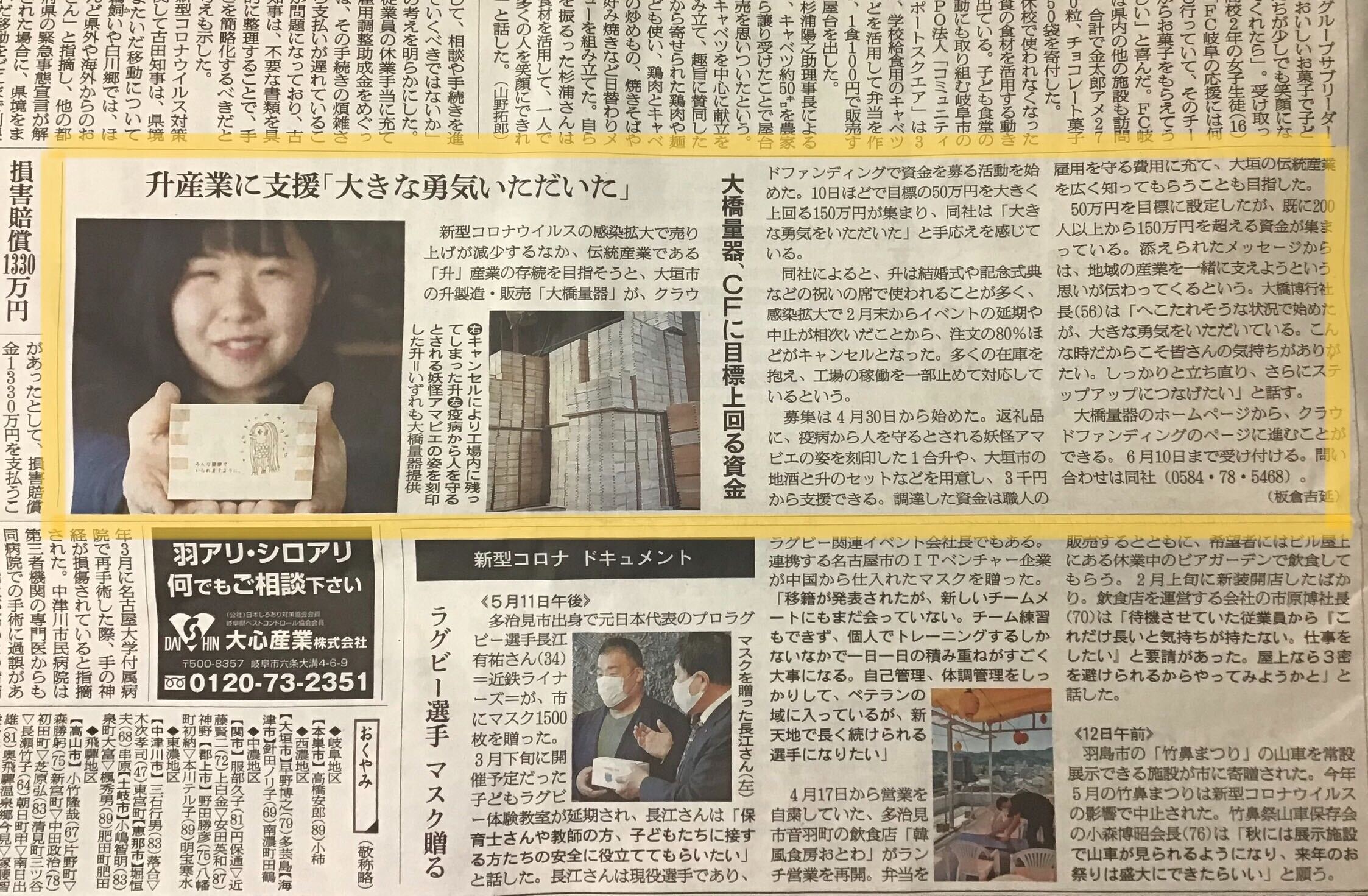 5月12日の朝日新聞岐阜版にて、今回のクラウドファンディングが取り上げられました!!