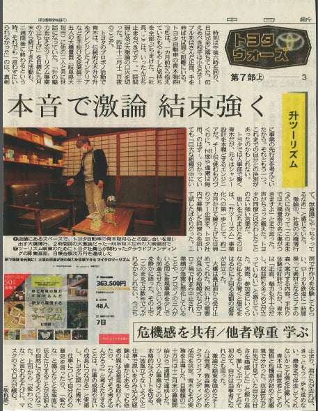 2021年1月28日(木)中日新聞経済面連載記事【トヨタウォーズ】に今回のツーリズム事業について掲載して頂きました!本事業は大橋量器チームとトヨタ自動車の社員3名がタッグを組んで作り上げてきました。この事業をするのにチーム内でツーリズムについて調べたり、実際に大垣市内を周り何か良いポイントになる場所やアイテムを探したり、週1回のオンラインミーティングでは毎回夜遅くまで議論を交わし激論になることもあり。。チーム一丸となって作りあげてきた、私達の想いがたくさん詰まっているのが今回の「枡×ツーリズム」です。ぜひ記事を読んでいただき私達がこの事業にかけた想いを感じて頂けたら幸いです!!クラウドファンディング残り5日となりました。ぜひ興味のありそうな方が周りにいらっしゃれば「大垣にこんな熱いを持った枡屋があるらしいよ!」とご紹介ください!!