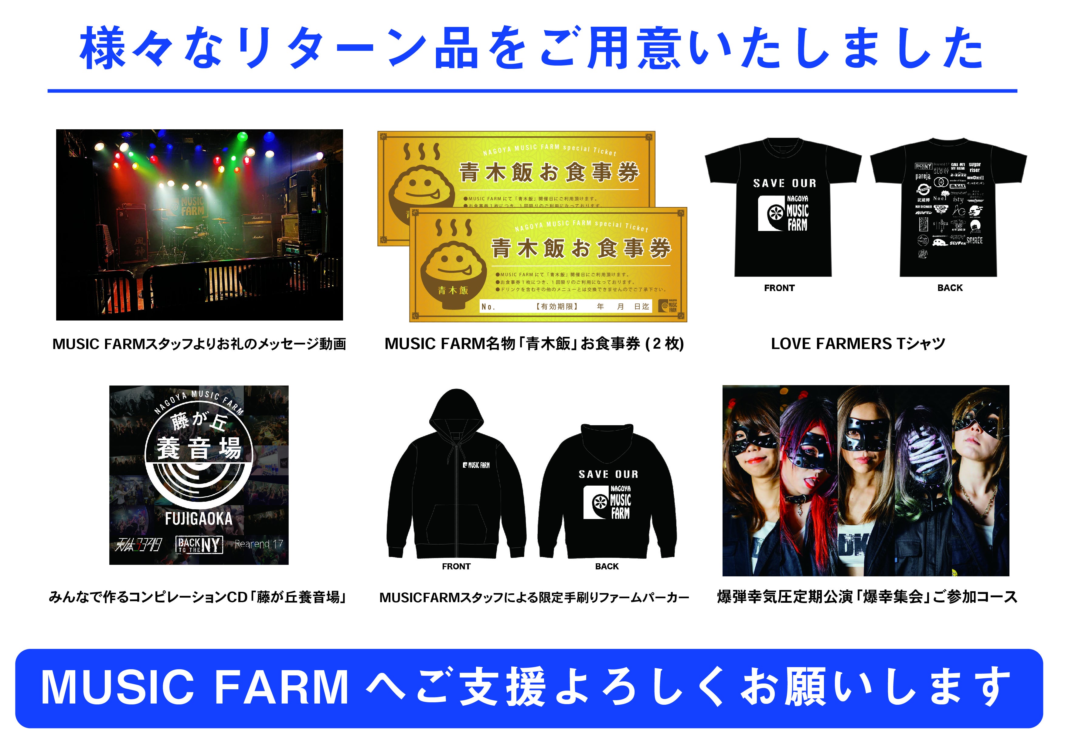 2020/06/29 21:00こんばんは。名古屋MUSIC FARMの田中です。皆様に支えられながら長きに渡ってこちらにてプロジェクトを進めさせていただきました。支援をして頂いた皆様、拡散にご協力を頂けた皆様、アドバイスを頂いた関係者の皆様心より感謝を申し上げます。SAVE OUR FARMは当初の予定より200%オーバーにて終了を間も無く迎えようとしております少し早いのですが活動報告も本日にて最終回。プロジェクト自体は残り2時間少しありますがここでお礼を述べさせてください。このプロジェクトを立ち上げた時はライブハウスには夢も希望もないような状況でした。何かしたいのに何もできないジレンマ。そんな中で普段からお世話になっているライブハウス高松MONSTERや今池3STARがクラウドファンディングを始めました。その2つのライブハウスのクラウドファンディングを見て僕は勇気をすごくもらいました。そしてSAVE OUR MUSICFARMを立ち上げるのに高松MONSTERのケンタロウさんと今池3STARやっさんには数えきれないアドバイスをいただきました。まずはこの2人に感謝いたします。さらにはcamp fireではないクラウドファンディングサイトの運営を行なっている(株)新東通信の杉山さんには考えを180度ひっくり返されるご意見を頂きました。間違いなく覚悟を決めた一つの要因です。クラウドファンディング開始前にMUSIC FARMに支援金を有志で持ってきてくれた地元バンドのみんな!本当にありがとうな!めちゃくちゃ勇気もらったよ。今回のクラウドファンディングのリターンプランに協力して頂いた全てのアーティストにも本当に感謝です。みなさん二つ返事で受けていただきました。またアーティスト様からのご提案を頂いたプランもありました。いよいよここからリターン制作に入ります。アーティスト様には引き続きよろしくお願いいたします。このクラウドファンディングをSNSで知って取材に来て頂いたNHK名古屋の小野さん。テレビ取材への僕らの不信感を拭い取るために何度も足を運んで僕の話を聞いてくれました。MUSIC FARMの現状を知るためにBACK TO THE NYの配信ライブも購入して頂いて。テレビなんて信用できないって態度を取ってて本当にすいませんでした。あなたが作ってくれたドキュメントよりの報道。ウチの親父がとても褒めてましたよ(笑)数え上げたらキリがありません。「おいおい俺の名前はここに出てこないのか?」って思ってらっしゃる方がいらっしゃたら申し訳ないです。ここでは紹介できないくらいのたくさんの人に支えていただきました。皆様何卒今後もよろしくお願いいたします。最後に今回のプロジェクトに関わって頂いた全ての方がこれからも健康で幸せに暮らせる事を祈っております。そして名古屋 MUSIC FARMから何かしら届くのをぜひ楽しみに待っていてください。我々も全力で楽しく制作していきます。名古屋MUSIC FARMはこれからも皆様と共に歩んで参ります。そこでこれまで行ってきた活動報告をブログという形にて続けることにさせて頂く事を決めましたこちらにて引き続きぜひお付き合い頂けたら幸いです。さて続いては名古屋MUSIC FARMスタッフから皆様に感謝を伝えさせてくださいホール/BAR 担当:青木コロナ渦になって大変なのは音楽業界、ライブハウス、そしてMUSIC FARMに限ったことでは決してない中で、たくさんの方々に支援して頂いて心からありがとうございました。MUSIC FARMが歩んできた33年間は、本当に多くの方に愛されいるのだと、今回改めて感じました。今中心となって働いているスタッフは、私を含めてこの場所が大好きな変わり者ばかりです。それでも全員で頭フル回転して、この場所をこれから必死で守っていこうと思います。まだまだ先は長い闘いですが、皆様から「楽しかったよ!」という言葉が聞けるように、安心して来られる場所をつくっていきます。そして、早く青木飯も復活させて皆様に美味しいご飯を提供できるように、より一層頑張ります!!照明担当:柴田皆様、何度でも言わせてください。本当にありがとうございました!クラウドファンディングをやったからこそ気付いた事がたくさんあって、自分たちが立っている場所がどんな所なのか改めて気づくことができました。最後まで一緒に戦ってもらって、応援してもらって、もう感謝しかありません、全てを誇りに思っています。ありがとうございました。これからもどうぞMUSICFARMをよろしくお願い致します。PA担当:立花SAVE OUR MUSIC FARMプロジェクトにご支援いただきまして本当にありがとうございます。本当に皆様に愛されているんだなと改めて感じることができました。ありがとうございました。MUSICFARMは小さな一歩ですが一つ一つ確実に前に進んでいます。引き続きご指導ご鞭撻のほどよろしくお願いいたします。ブッキング担当:櫻井クラウドファンディングへのご協力本当にありがとうございます。皆様の温かいご支援のお陰で私達は前に向かって進んでいけます。この御恩は忘れません。繋いで頂いたこの場所
