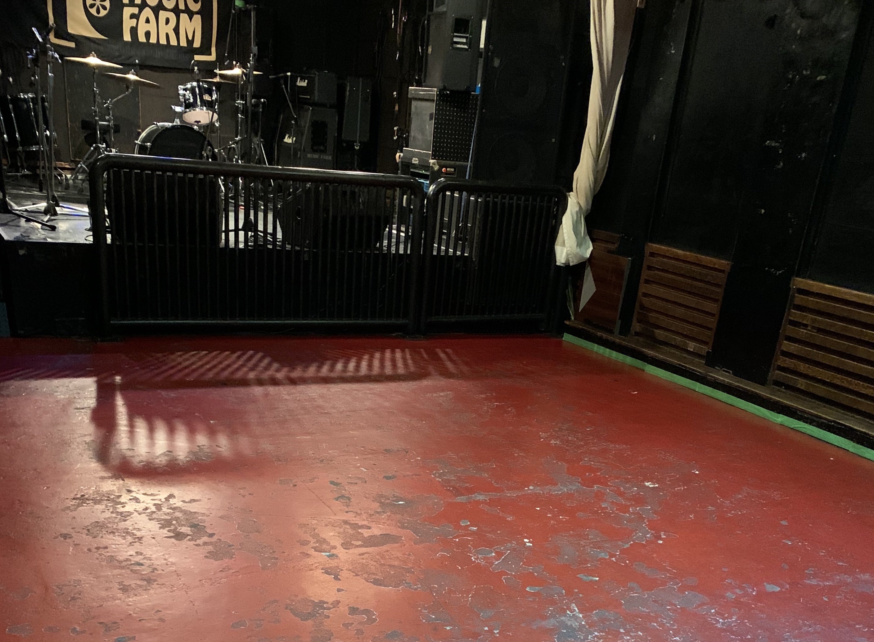 そして本日は照明担当の柴田と副店長田中とでホールの床のペンキ塗りをしました。