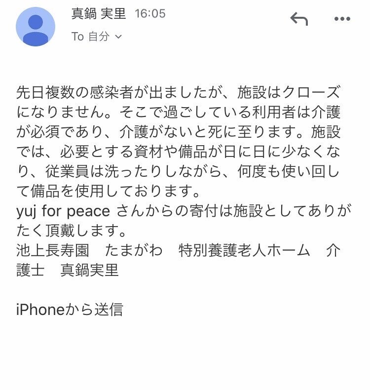 yuj for peace さんからの寄付は施設としてありがたく頂戴します。介護士 真鍋実里さん)