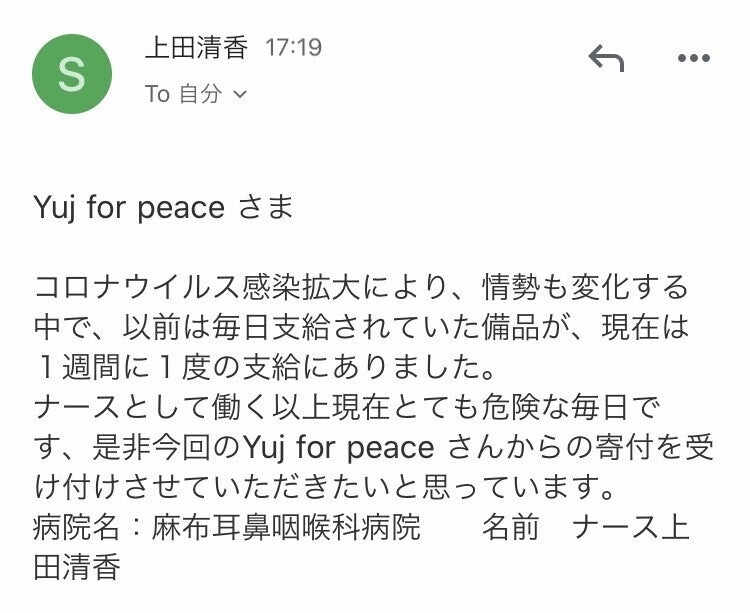 ナースとして働く以上現在とても危険な毎日です、是非今回のYuj for peace さんからの寄付を受け付けさせていただきたいと思っています。ナース上田清香さん)