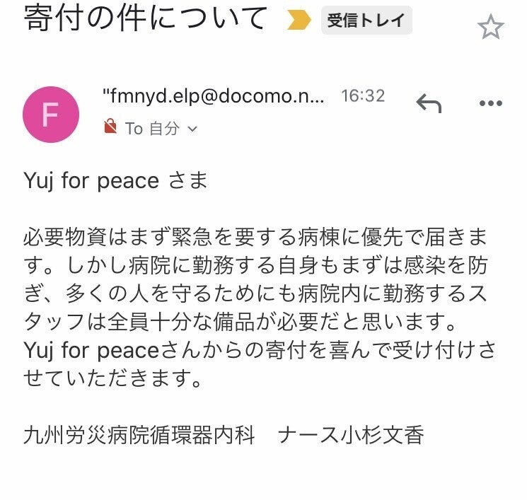 Yuj for peaceさんからの寄付を喜んで受け付けさせていただきます。ナース小杉文香さん)