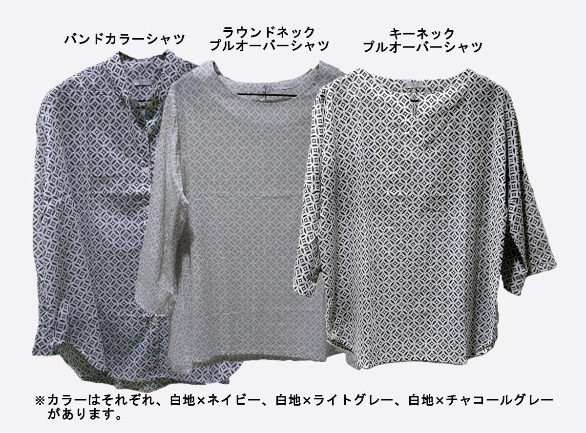 今回は、モルモルコットンと呼ばれる目の細かい(60番ローン程度の厚さ)綿100%の生地を使った、着心地の良いシャツをお届けします。モルモルコットンは綿100%のナチュラルな風合いで、高級感ある素材です。オリジナルのデザインで、キーネックプルオーバーシャツ、ラウンドネックプルオーバーシャツ、バンドカラーシャツの3種類。それぞれネイビー、ライトグレー、チャコールグレーの3色をご用意しています。