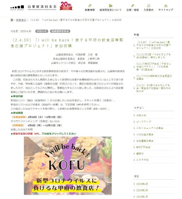 本日、山梨経済同友会 様のご厚意で、山梨経済同友会 のホームページでプロジェクトをご紹介いただきました。同友会 様から、″困ったときこそ助け合わなきゃ”と、お申し出いただきました。本当に有難いかぎりです。