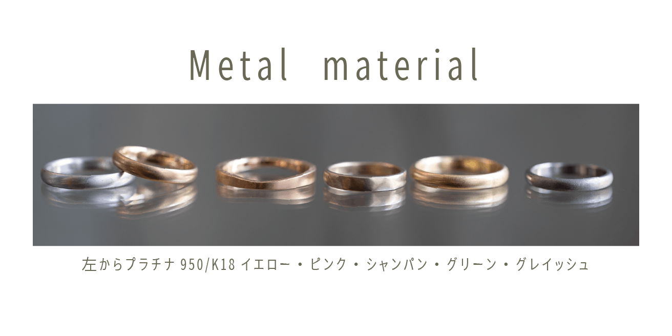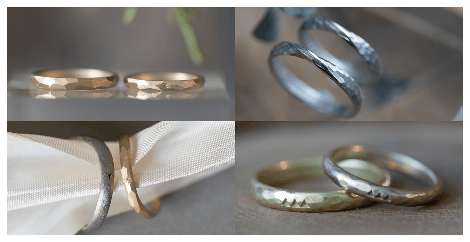 地金素材の色、テクスチャー、リングの幅、その他付け心地などのこだわりをご相談いただきながら指輪に施します。