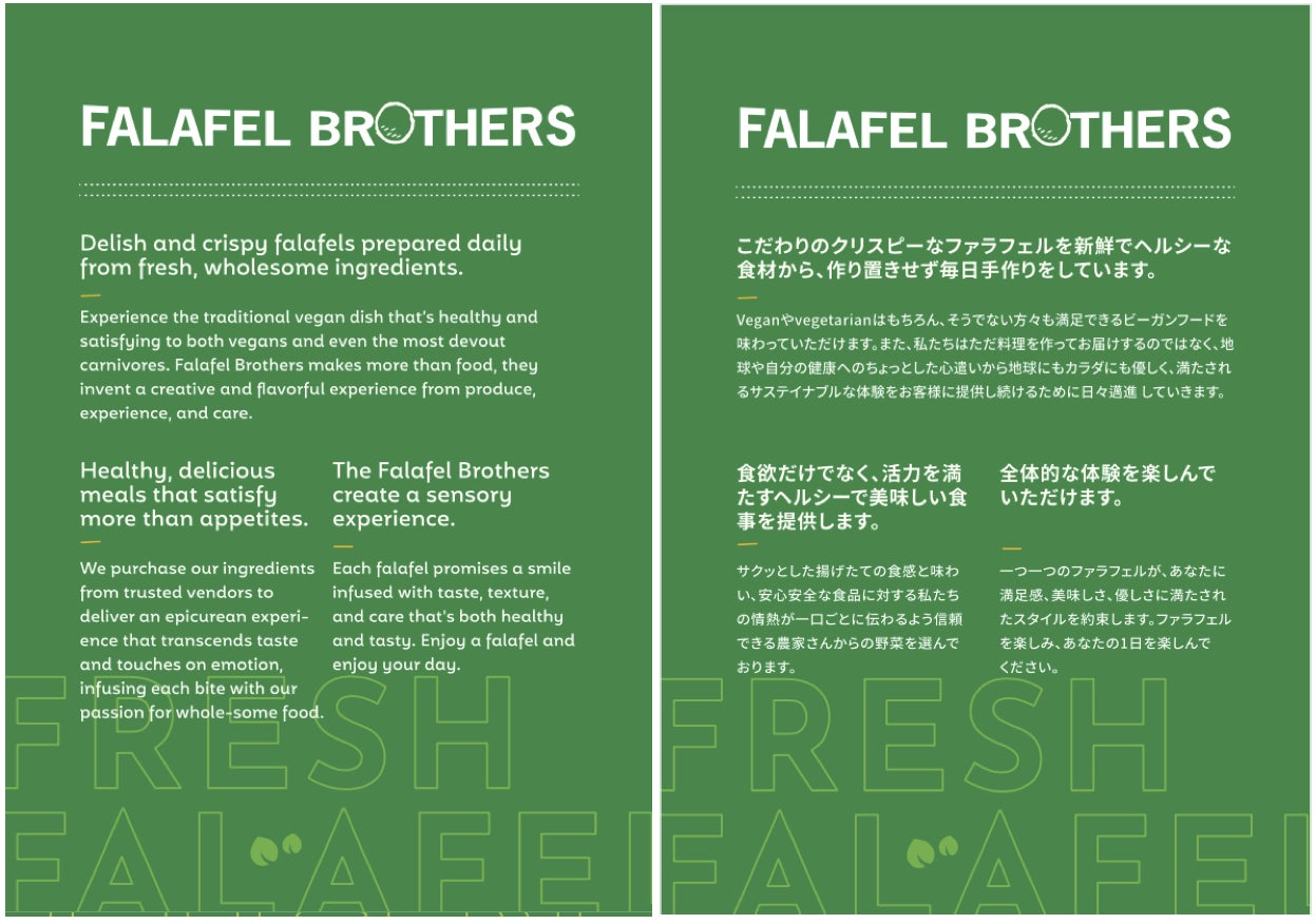 動物性食材を一切使わないVEGANをコンセプトとした当店は六本木、恵比寿、渋谷パルコにお店がございます。創業以来VEGAN,VEGETARIANの方のみならずたくさんのお客様にきて頂いております。我々のメインの商品はファラフェルというひよこ豆で作ったコロッケをイスラエルから直接輸入しているピタで挟み、たくさんの野菜を詰め込んだサンドイッチでございます。ヘルシーなだけじゃないボリューム満点の満足感やしっかりとした味が人気ではございますが、veganという選択肢が環境や動物に対してどれだけ意味のあるものなのかを知っていただくきっかけになればと思っております。