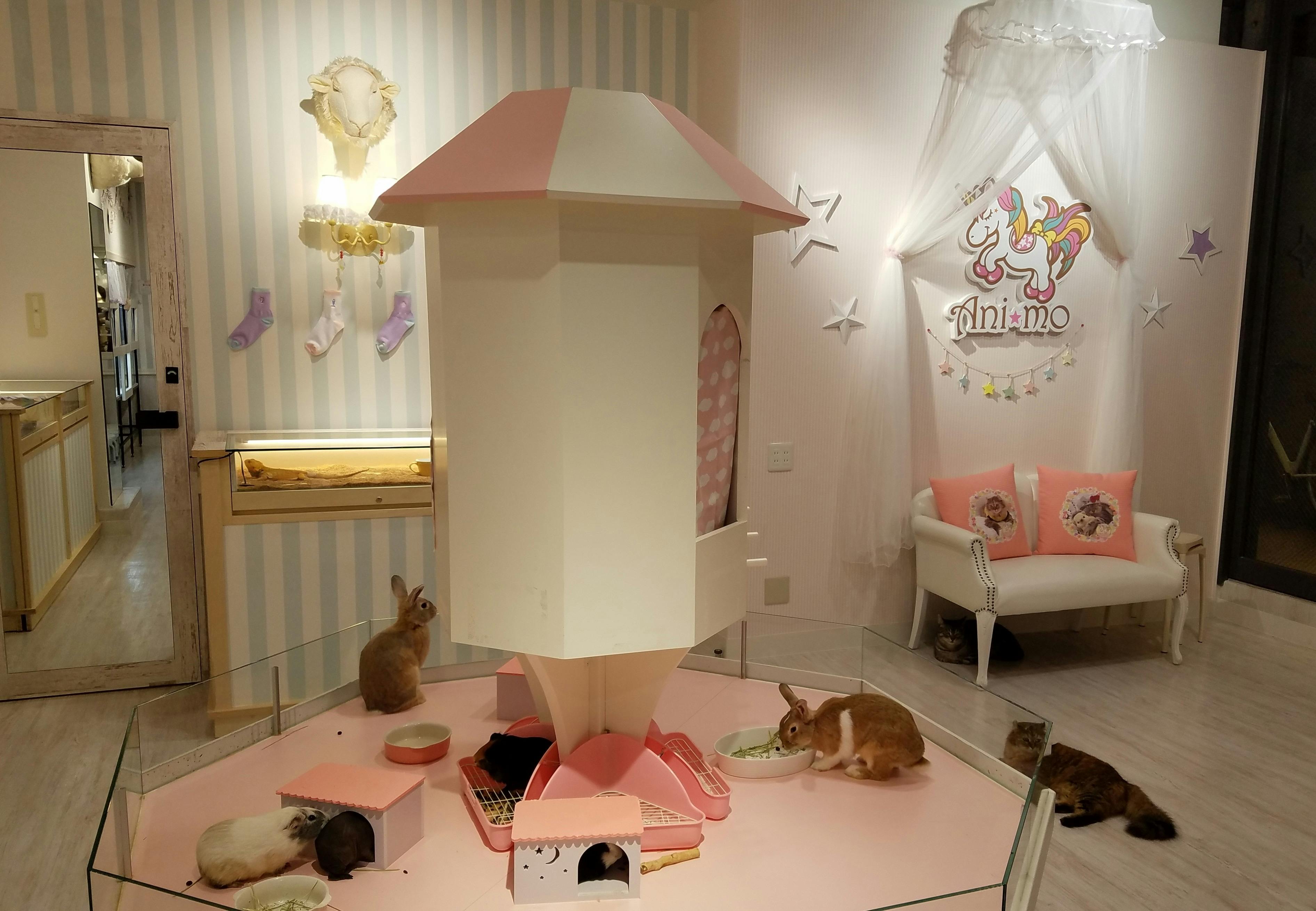 「アニモ」は”ゆめかわ”がコンセプトの小さな屋内どうぶつ園です。4匹の猫ちゃんと、うさぎやモルモット、チンチラ、ハムスター、小鳥、やさしいミーアキャットやフェレット。フクロウから爬虫類まで色々などうぶつたちが同居する綺麗でかわいい癒しのお店です。