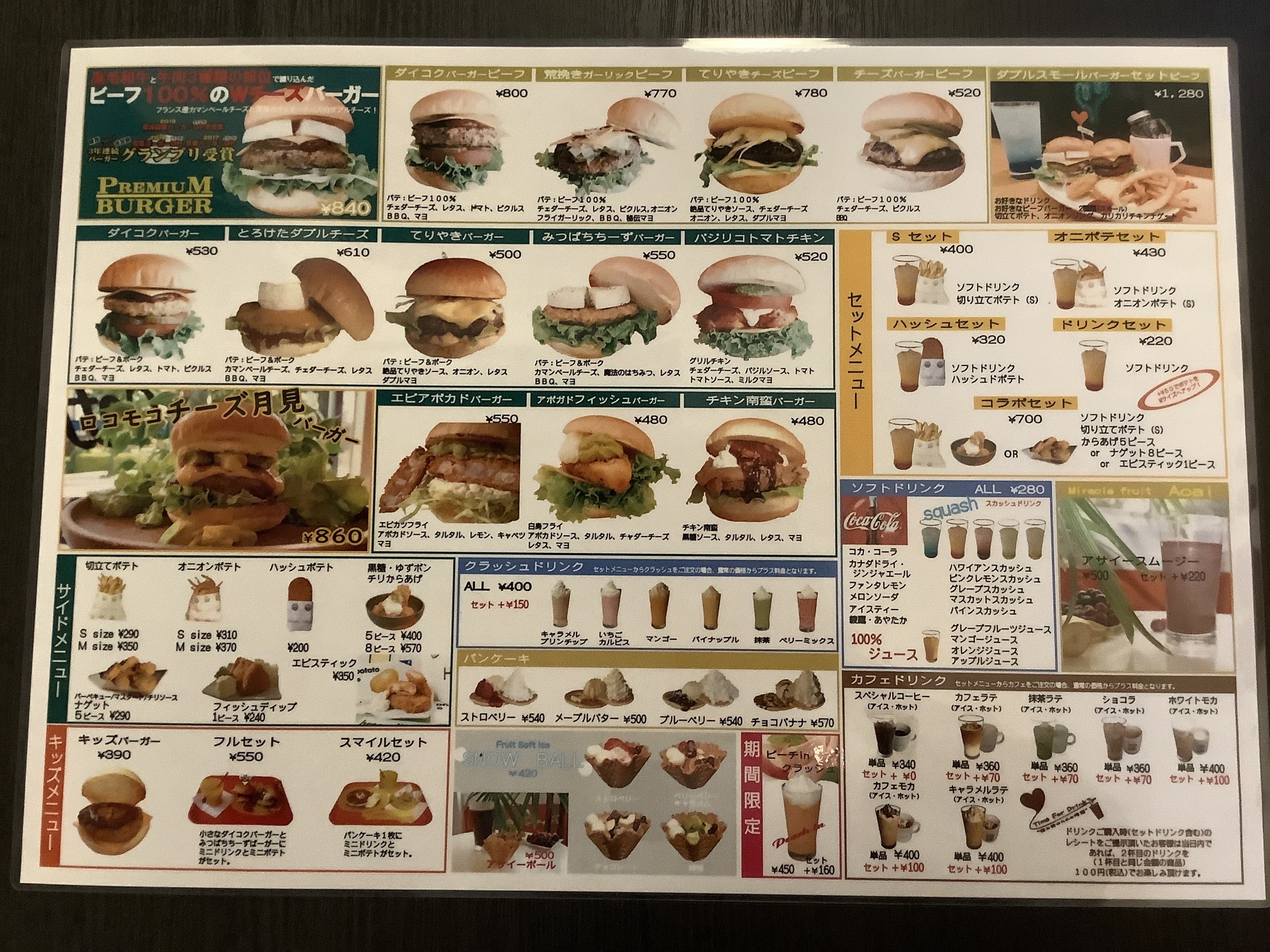 関西No.1決定戦のバーガーグランプリで3年連続受賞している「ビーフ100%のWチーズバーガー」が目玉!