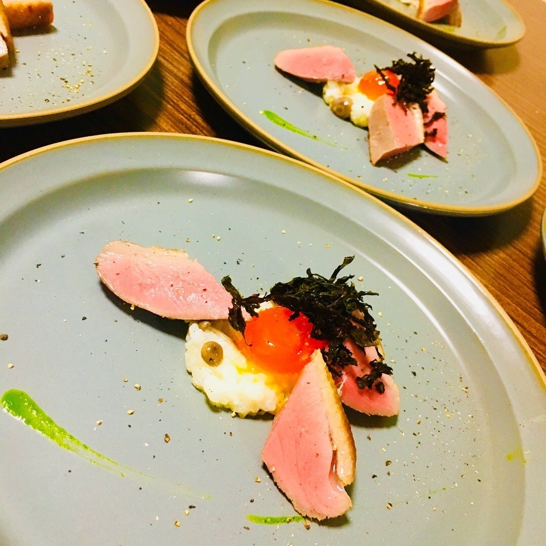コース:いとこ丼(鴨肉のロースト、卵黄の味噌付け、山葵のリゾット)